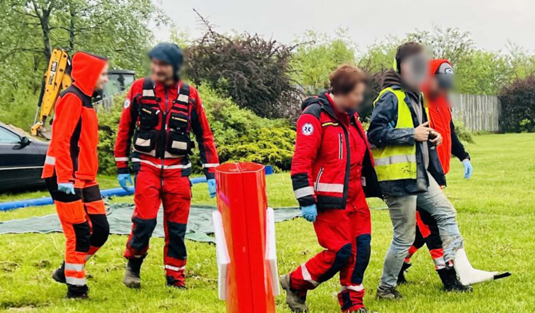 Na miejsce ruszyły służby ratunkowe; straż pożarna PSP Wołomin, OSP Marki, policja oraz właśnie helikopter LPR. Po znalezieniu lądowiska i dotarciu do rannego okazało się, że owszem znajduje się tam osoba poszkodowana, ale nie w głębokim dole, a ze skręconą nogą uszkodzoną podczas wysiadania z koparki. Lekarz z podniebnej karetki opatrzył kończynę, a po chwili zjawił się naziemny zespół medyczny, który „na kołach” zabrał uśmiechniętego pacjenta do szpitala. Wypadek na przydrożnej budowie spowodował spore utrudnienia w obu kierunkach. Ruch przez około godzinę odbywał się wahadłowo.