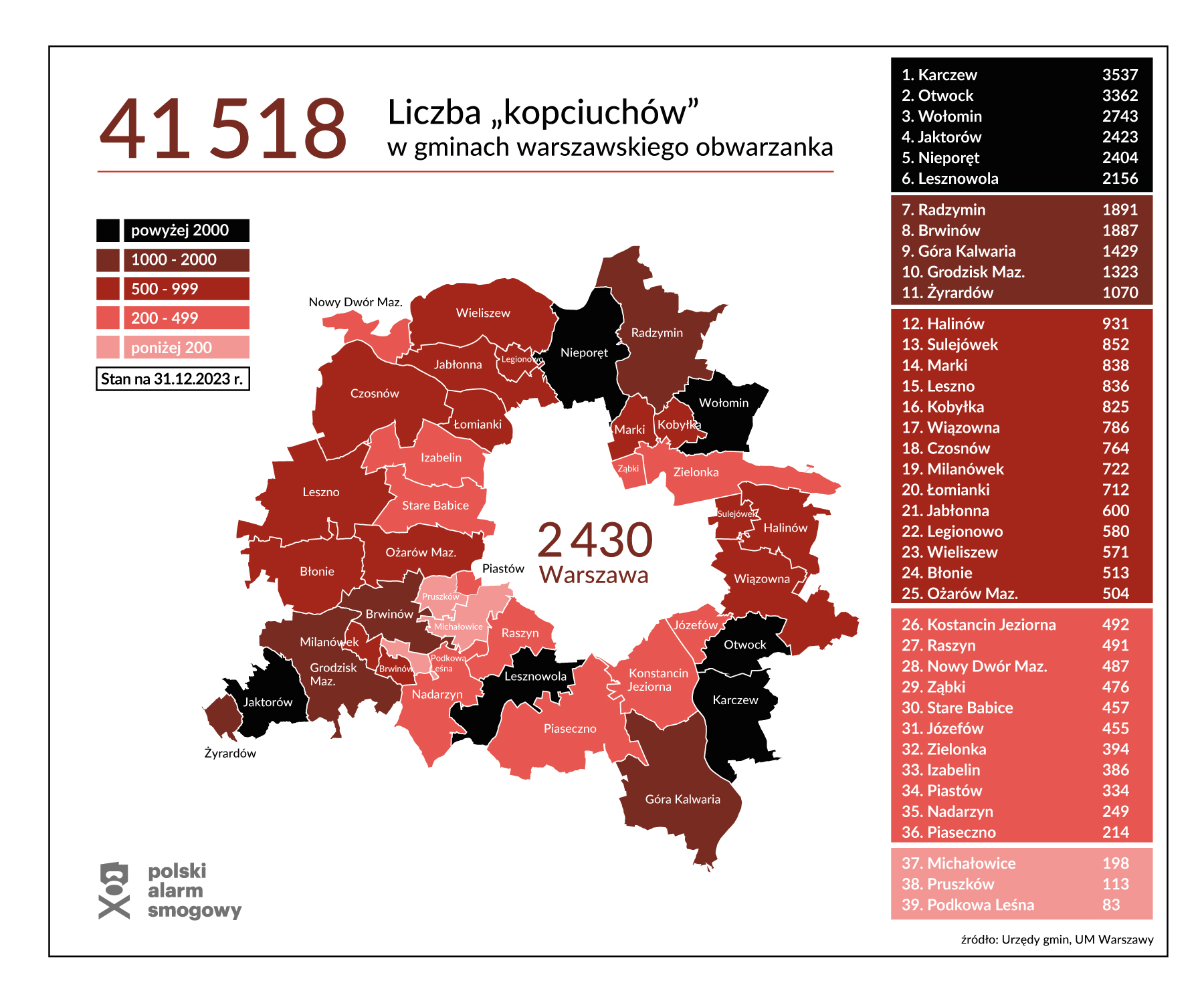 Gminy z metropolii warszawskiej na podstawie własnych inwentaryzacji i bazy CEEB znają liczbę kotłów na swoim terenie. Polski Alarm Smogowy dotarł do tych danych i opublikował je w graficznej formie. Okazało się, że w “warszawskim obwarzanku”, czyli 39 gminach okalających stolicę, dymi jeszcze 41 518 pozaklasowych kotłów na węgiel i drewno. Największa liczba takich urządzeń znajduje się w Karczewie (3537), Otwocku (3362) i Wołominie (2743). Najmniej kotłów dymi w Podkowie Leśnej – 83. Część tych kotłów nie jest używana i służy jako zapasowe źródło ciepła, część została zadeklarowana w CEEB w momencie ogłoszenia dopłaty do węgla w 2022 roku (3 tysiące zł), co spowodowało spory bałagan w bazie danych. Nie są to jednak liczby, które znacznie zmniejszają wielkość problemu.