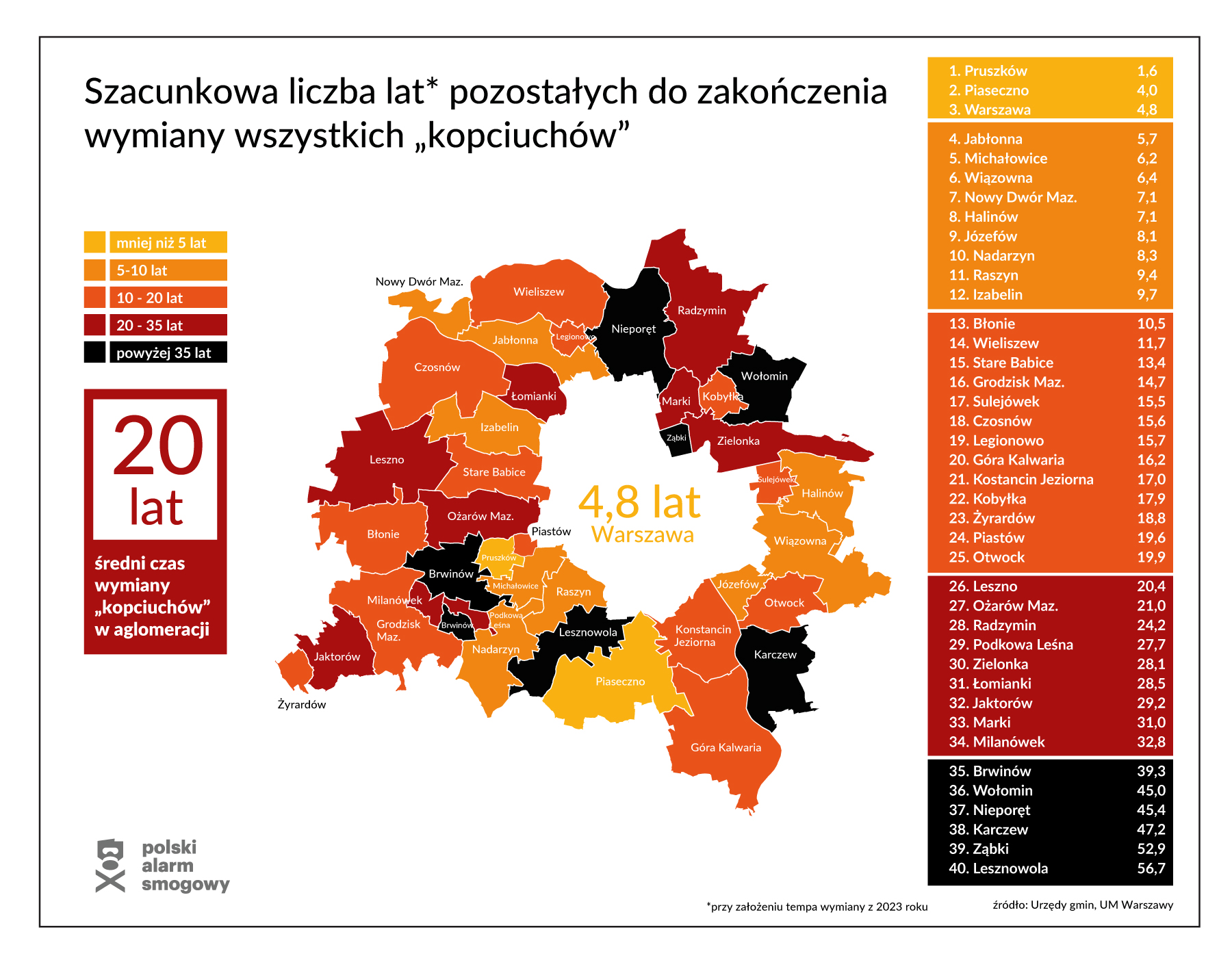 Ciekawie przedstawia się prognoza, jak wiele lat, biorąc pod uwagę aktualne tempo wymian, zajęłoby gminom dojście do zakończenia wymiany kotłów. Rekordowa gmina, Lesznowola poradziłaby sobie z problemem za 57 lat, nieco wcześniej kotły zlikwidują Ząbki (za 53 lata) oraz Karczew z Wołominem (za 45 lat). Najszybciej kotły wymieniają mieszkańcy Pruszkowa, gdzie – jeśli tempo wymiany zostanie utrzymane – ostatni „kopciuch” zniknie za półtora roku.