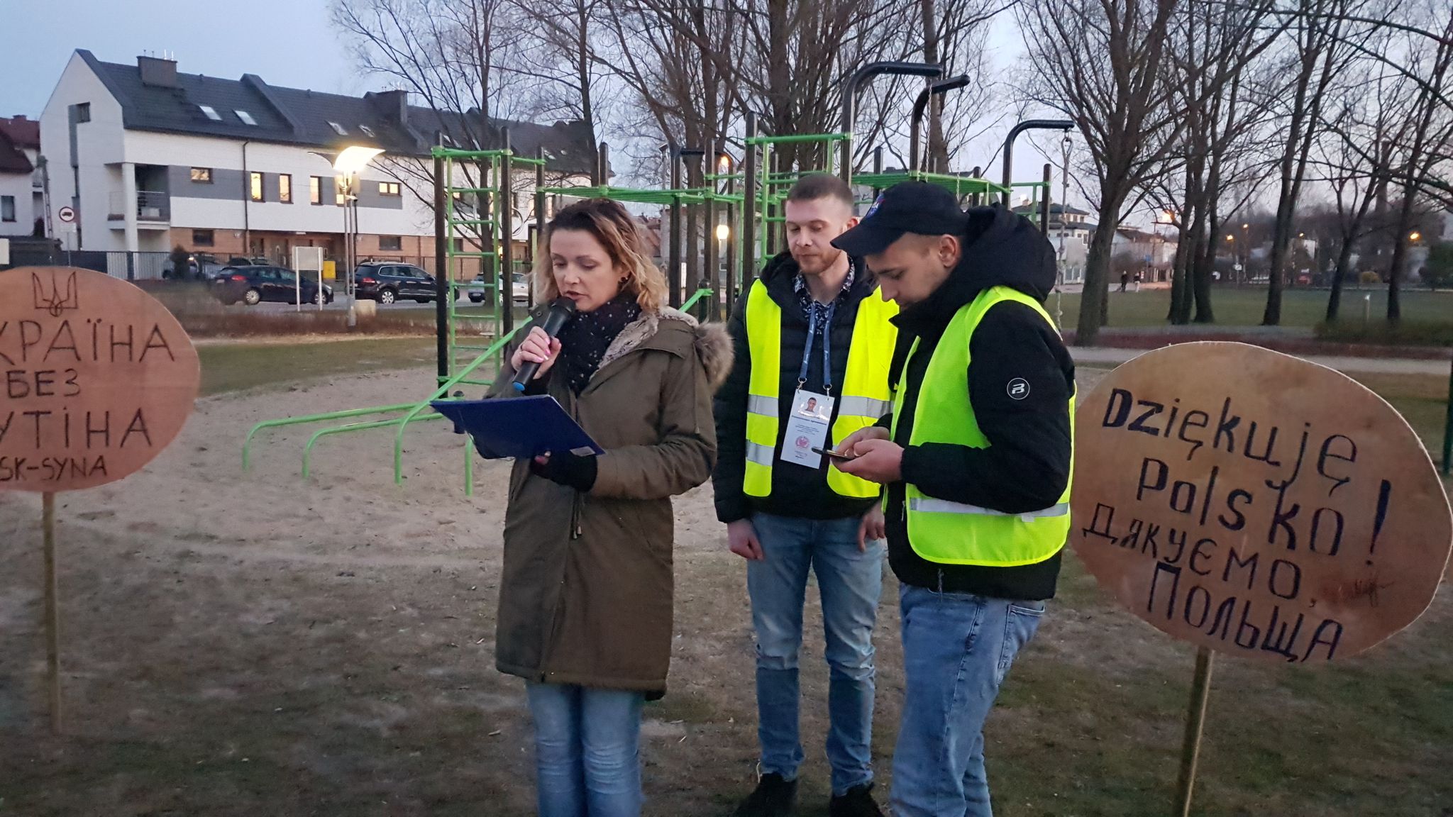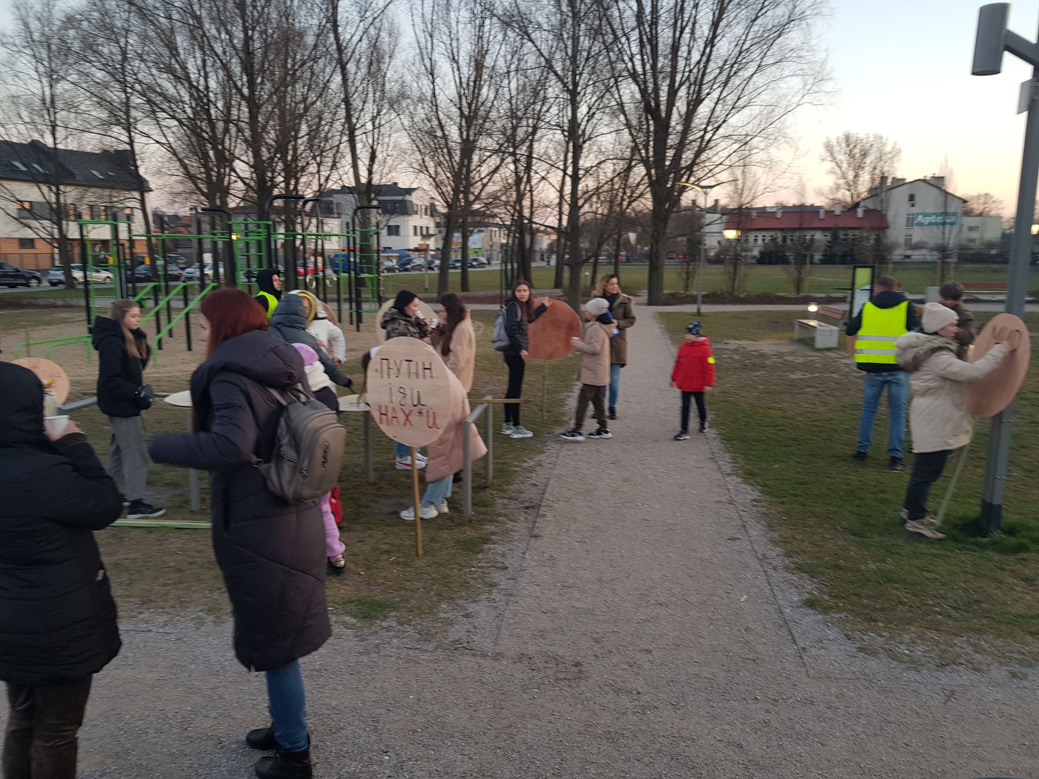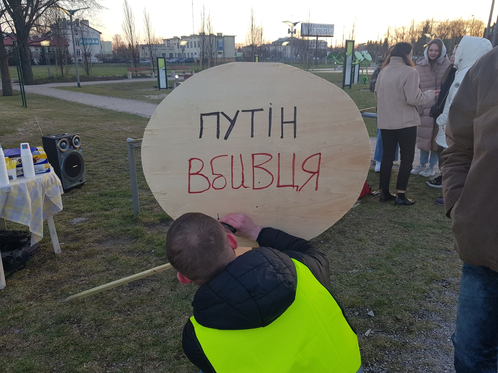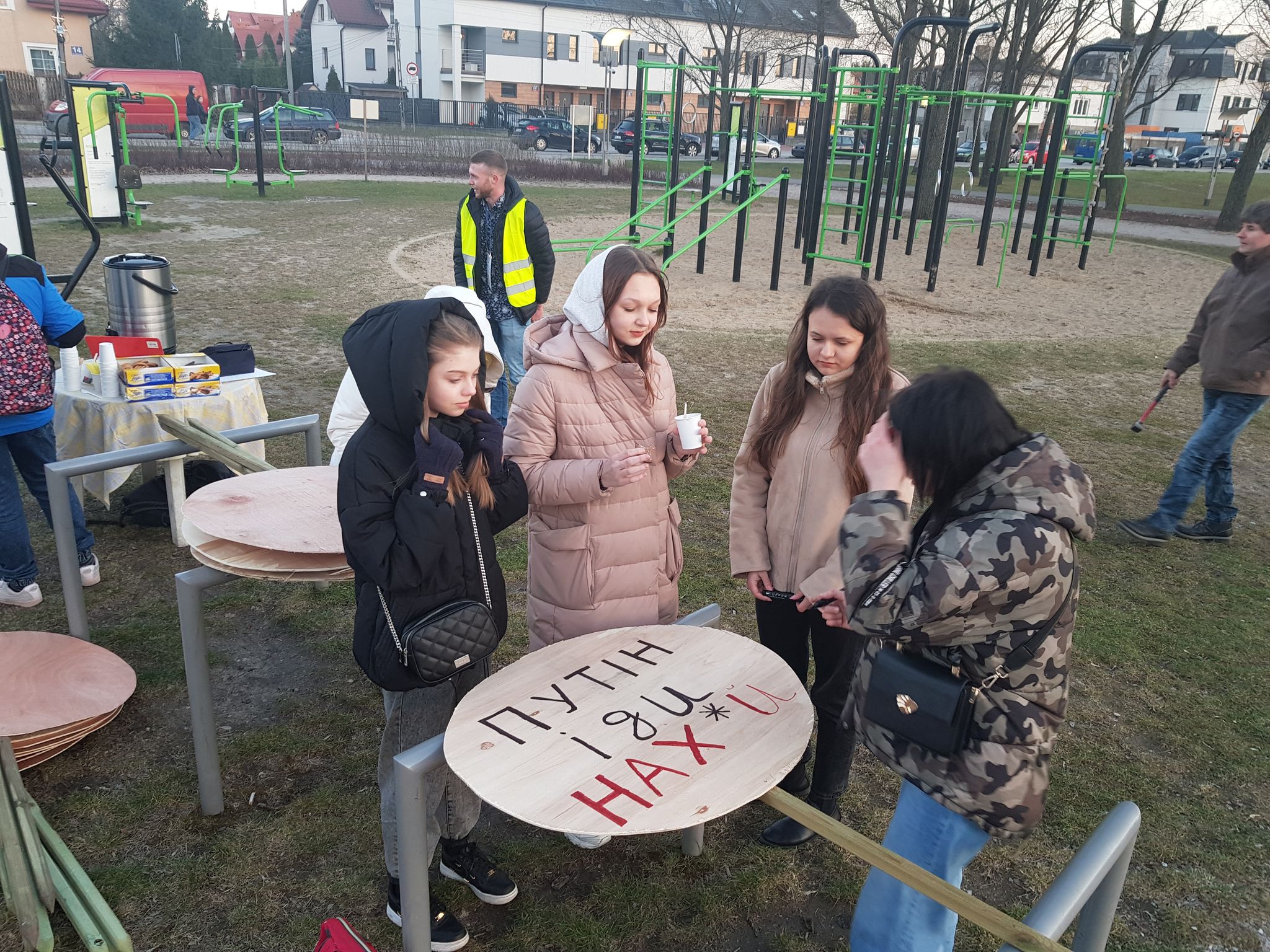 – Pogoda pod wieczór była jak na zamówienie. Jedynym wyjątkiem była niska temperatura, ale i z tym sobie poradziliśmy. Blisko 40 osób biorących udział w evencie miało możliwość ogrzania się gorącą herbatą. Gorętsze od najbardziej gorącej herbaty były jednak serca uczestników. Wykonaliśmy łącznie 19 drewnianych szyldów, a efekty naszej wspólnej pracy możecie obejrzeć w Parku Wolontariuszy. Udało nam się sprawić, że na twarzach naszych ukraińskich przyjaciół zagościł uśmiech. Każdy miał okazję sprzeciwić się wojnie i działaniom mordercy Putina na swój sposób i swoimi słowami. Na szyldach znalazły się też słowa podziękowania za polską ofiarność i zaangażowanie Polaków w pomoc Ukraińcom. Ostatnia część happeningu była bardzo wzruszająca. Po apelu przygotowanym przez Magdę Burlikowską, oddaliśmy przy blasku świec cześć bestialsko pomordowanym cywilom i żołnierzom, którzy polegli w obronie swojej ojczyzny. Następnie wspólnie zaśpiewaliśmy przepiękną, ukraińską pieśń ludową i hymny Ukrainy i Polski. Nie zabrakło uścisków, łez wzruszenia, uśmiechów i pamiątkowego zdjęcia. Bardzo dziękuję wszystkim, którzy organizacyjnie przyczynili się do sukcesu happeningu, czyli Magdzie Burlikowskiej odpowiedzialnej za część wokalno-artystyczną, Radnemu Miasta Marki Tomaszowi Paciorkowi, z którym przygotowywaliśmy wcześniej nasze drewniane szyldy a także który odpowiedzialny był za gorącą herbatę oraz przemyskiemu oddziałowi Związku Ukraińców w Polsce, którego członkowie pomogli w tłumaczeniu haseł i zaproszenia. Wielkie podziękowania należą się Dimie, który przyjechał z Torunia specjalnie po to, żeby z nami być i pomóc w przełamywaniu ewentualnych barier językowych. Dziękuję wszystkim Polakom i Ukraińcom, którzy byli z nami wczoraj. Niech żyje wolna Ukraina! – podsumował wydarzenie jeden z organizatorów Łukasz Krzemiński
