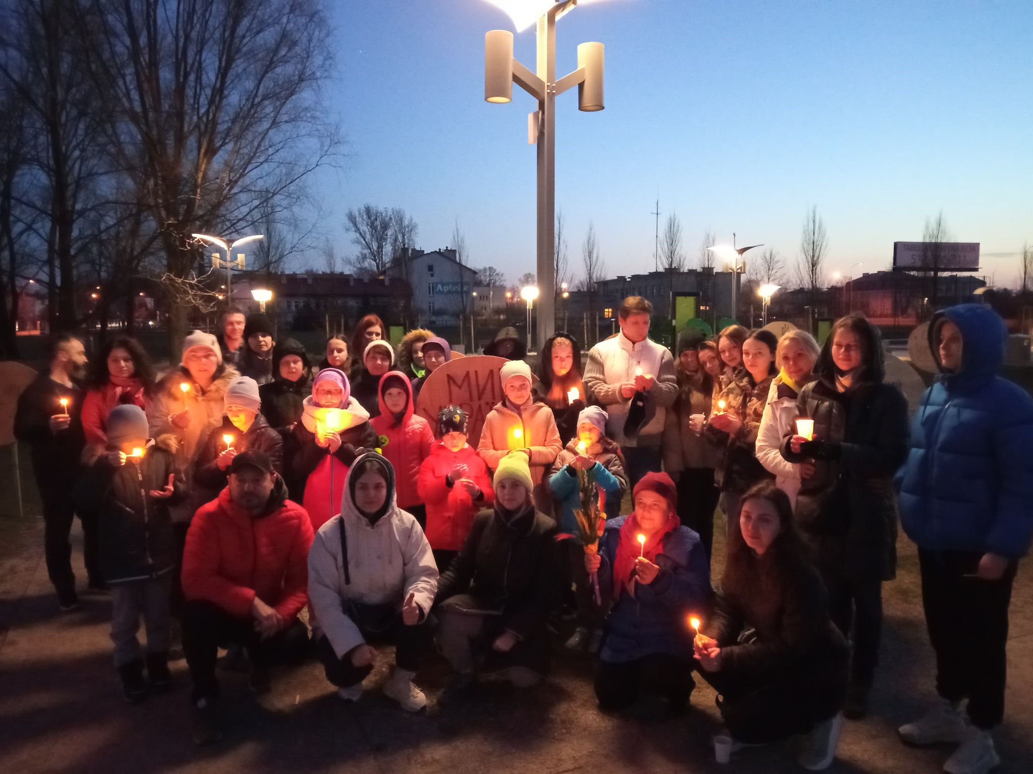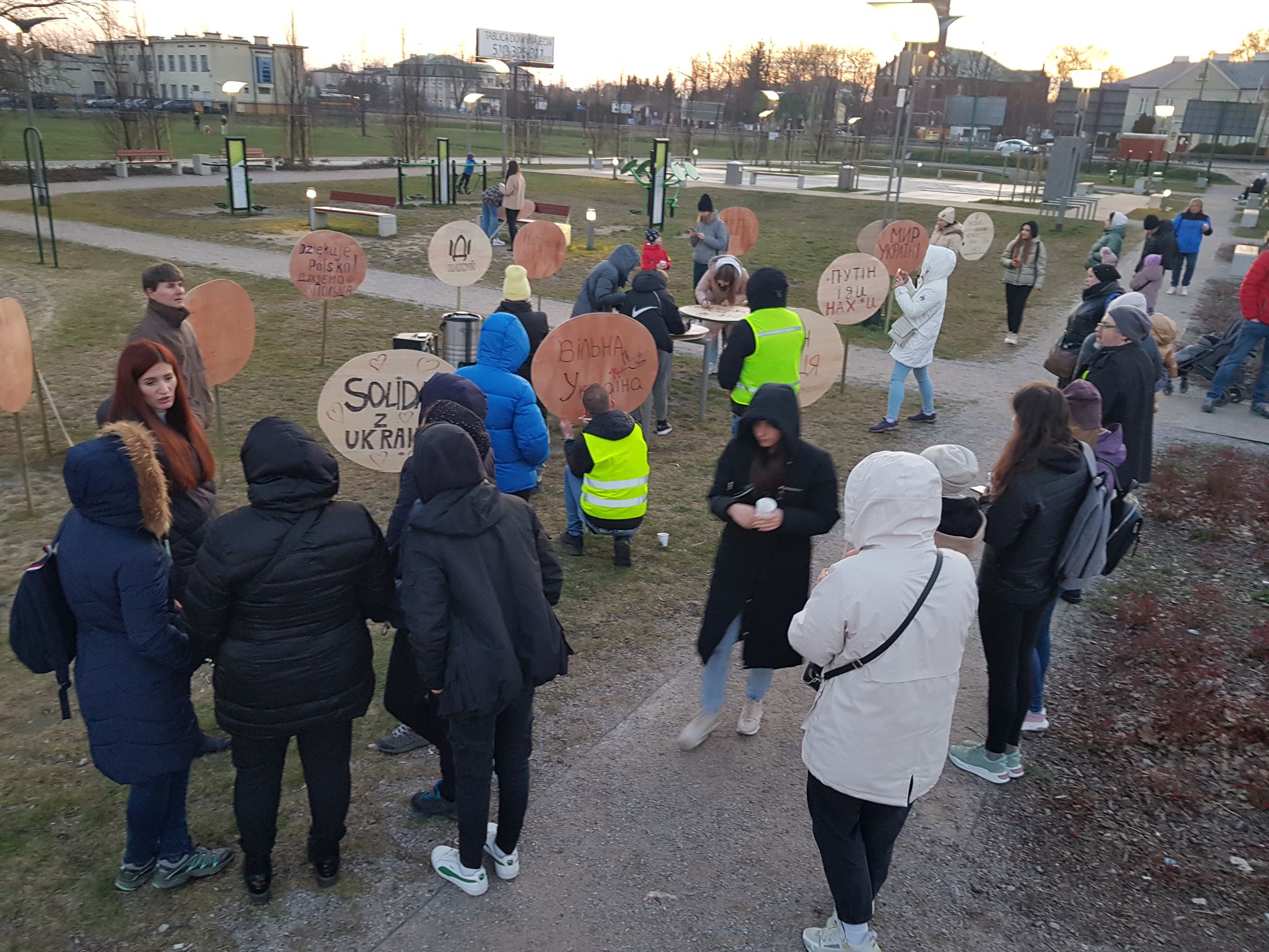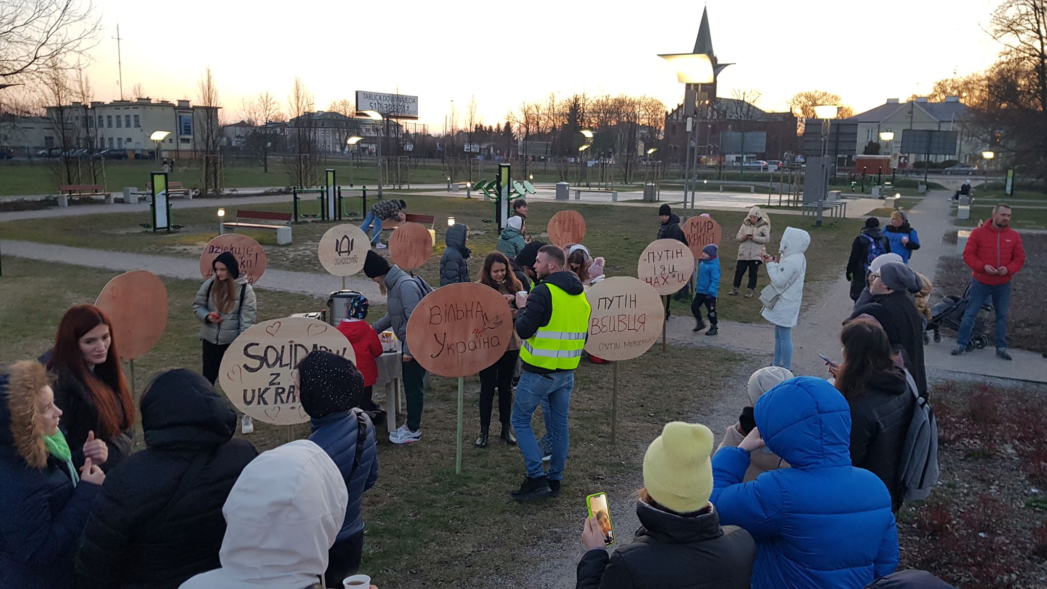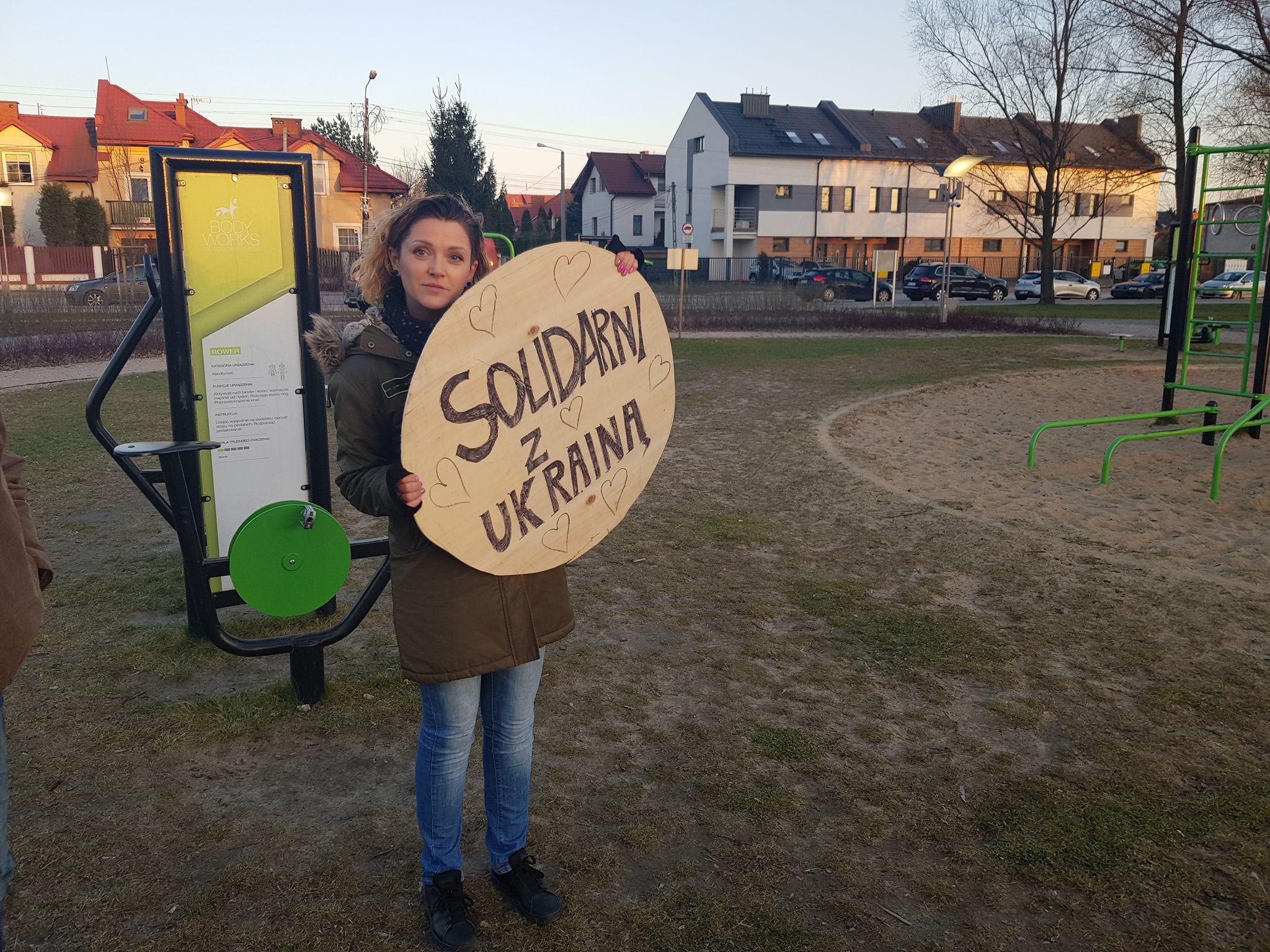 – Pogoda pod wieczór była jak na zamówienie. Jedynym wyjątkiem była niska temperatura, ale i z tym sobie poradziliśmy. Blisko 40 osób biorących udział w evencie miało możliwość ogrzania się gorącą herbatą. Gorętsze od najbardziej gorącej herbaty były jednak serca uczestników. Wykonaliśmy łącznie 19 drewnianych szyldów, a efekty naszej wspólnej pracy możecie obejrzeć w Parku Wolontariuszy. Udało nam się sprawić, że na twarzach naszych ukraińskich przyjaciół zagościł uśmiech. Każdy miał okazję sprzeciwić się wojnie i działaniom mordercy Putina na swój sposób i swoimi słowami. Na szyldach znalazły się też słowa podziękowania za polską ofiarność i zaangażowanie Polaków w pomoc Ukraińcom. Ostatnia część happeningu była bardzo wzruszająca. Po apelu przygotowanym przez Magdę Burlikowską, oddaliśmy przy blasku świec cześć bestialsko pomordowanym cywilom i żołnierzom, którzy polegli w obronie swojej ojczyzny. Następnie wspólnie zaśpiewaliśmy przepiękną, ukraińską pieśń ludową i hymny Ukrainy i Polski. Nie zabrakło uścisków, łez wzruszenia, uśmiechów i pamiątkowego zdjęcia. Bardzo dziękuję wszystkim, którzy organizacyjnie przyczynili się do sukcesu happeningu, czyli Magdzie Burlikowskiej odpowiedzialnej za część wokalno-artystyczną, Radnemu Miasta Marki Tomaszowi Paciorkowi, z którym przygotowywaliśmy wcześniej nasze drewniane szyldy a także który odpowiedzialny był za gorącą herbatę oraz przemyskiemu oddziałowi Związku Ukraińców w Polsce, którego członkowie pomogli w tłumaczeniu haseł i zaproszenia. Wielkie podziękowania należą się Dimie, który przyjechał z Torunia specjalnie po to, żeby z nami być i pomóc w przełamywaniu ewentualnych barier językowych. Dziękuję wszystkim Polakom i Ukraińcom, którzy byli z nami wczoraj. Niech żyje wolna Ukraina! – podsumował wydarzenie jeden z organizatorów Łukasz Krzemiński