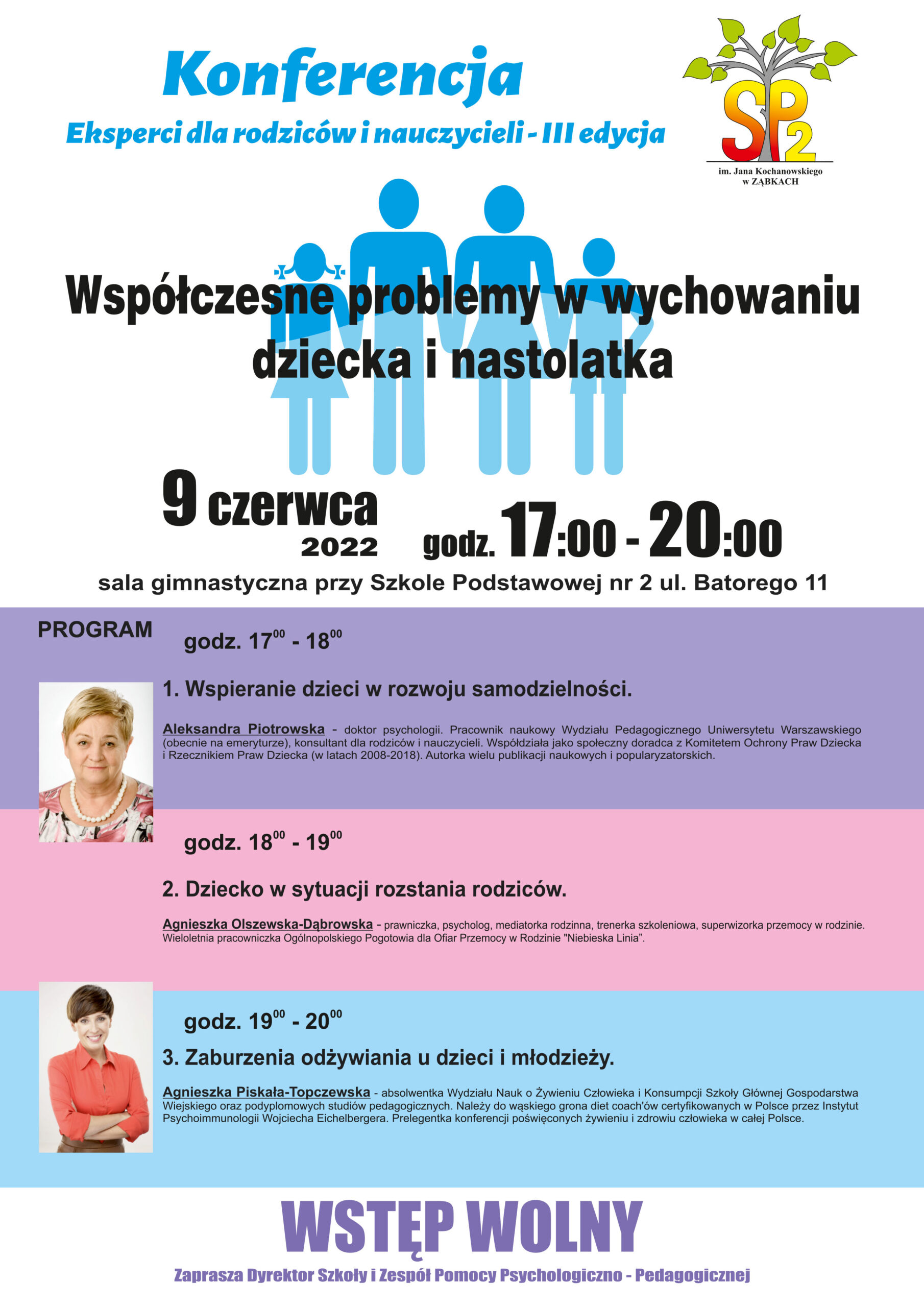 Szkoła Podstawowa Nr 2 w Ząbkach zaprasza na konferencję w dniu 9 czerwca 2022 r. w godz. 17:00-20:00. Konferencja „Współczesne problemy w wychowaniu dziecka i nastolatka” skierowana jest do rodziców i nauczycieli. Wstęp wolny.