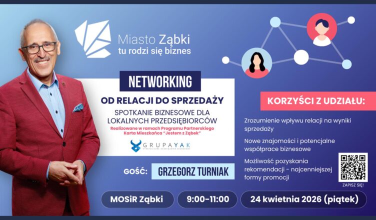Miasto Ząbki aktywnie wspiera rozwój lokalnego biznesu, dlatego tworzy przestrzeń do budowania wartościowych relacji wśród lokalnych przedsiębiorców. Małgorzata Zyśk Burmistrz Miasta Ząbki zaprasza na wyjątkowe spotkanie biznesowe, które pomoże spojrzeć na rozwój firmy z zupełnie nowej perspektywy. Gościem specjalnym spotkania będzie Grzegorz Turniak – jeden z najbardziej doświadczonych ekspertów networkingu w Polsce, mentor, strateg i mówca.
