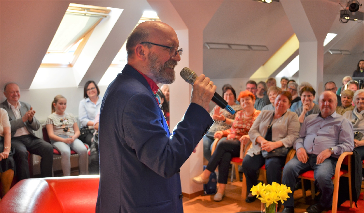 Artur Barciś aktor filmowy, teatralny, telewizyjny i dubbingowy, reżyser i scenarzysta. Nasz gość stworzył wiele wybitnych kreacji aktorskich. Grał u Kieślowskiego, Hoffmana, Wajdy i Kutza. Dużą popularność przyniosły mu role komediowe „inżyniera instalacji podziemnych” w serialu „Miodowe lata” oraz Czerepacha w „Ranczu”. Podczas spotkania Pan Artur opowiedział o cieniach i blaskach grania w bardzo popularnych produkcjach, i o tym, jak ważny jest warsztat i profesjonalizm w pracy aktora. Do kiedy chciałby być aktywny zawodowo? W dobrym zdrowiu aż do śmierci. Dlatego też nasz gość zachęcał do badań profilaktycznych. Prywatnie Artur Barciś jest mężem ukochanej żony, której oświadczył się podczas pierwszego spotkania i która, te oświadczyny przyjęła. Podczas wieczoru Pani Dyrektor Izabela Bochińska, prowadząca spotkanie, przywoływała fragmenty książki „Aktor musi grać, by żyć”, a której tytuł jest równocześnie piosenką, podziękowaniem dla widzów.