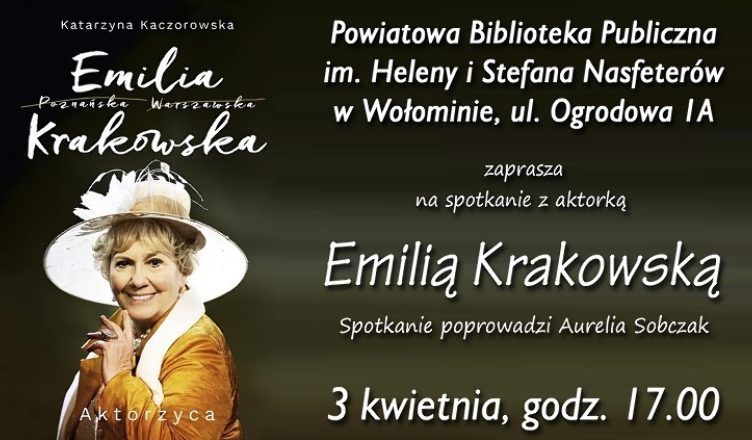 Powiatowa Biblioteka Publiczna zaprasza na spotkanie z aktorką Emilią Krakowską, które odbędzie się w dniu 3 kwietnia (środa) o godzinie 17.00 ul. Ogrodowa 1A.