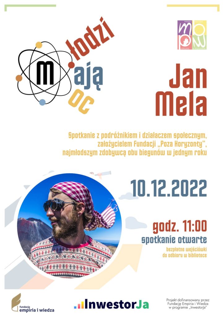 Przed nami wielki finał projektu „Młodzi Mają Moc”. Wołomińska biblioteka zaprasza na spotkanie z podróżnikiem i działaczem społecznym Janem Melą, założycielem Fundacji Jaśka Meli Poza Horyzonty. Jan Mela jest najmłodszym w historii zdobywcą dwóch biegunów w jednym roku, a zarazem pierwsza osobą z niepełnosprawnością, która tego dokonała. Swoją postawą motywuje wszystkich, nie tylko osoby z niepełnosprawnościami, dając przykład siły woli i samozaparcia w dążeniu do upragnionego celu.