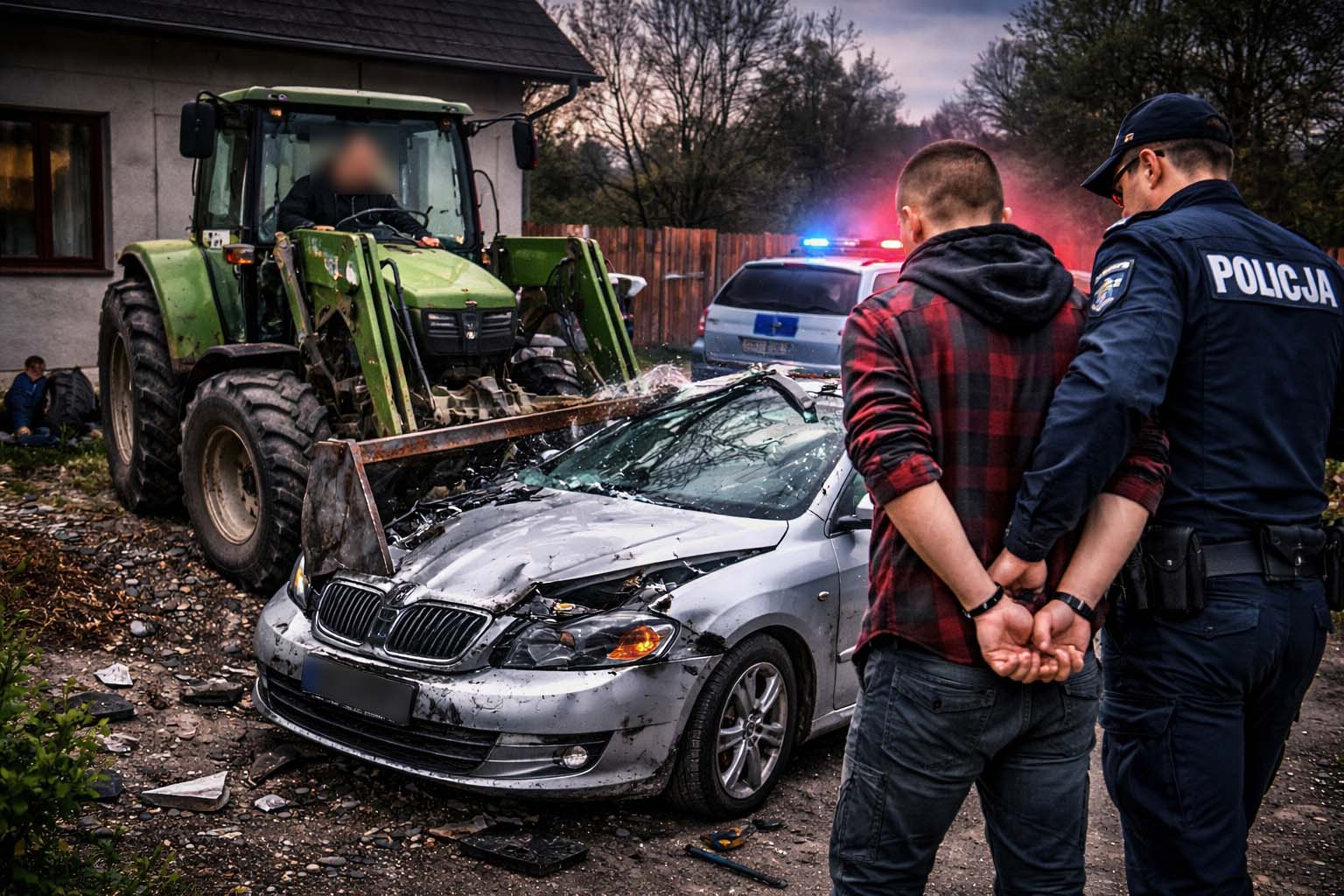 W miniony wtorek, 7 kwietnia 2026 r., dyżurny ciechanowskiej komendy otrzymał zgłoszenie o awanturze w miejscowości Rutki-Marszewice. Skierowani na miejsce policjanci ustalili, że 38-letni mężczyzna podczas kłótni z członkami rodziny wsiadł za kierownicę ciągnika rolniczego i wykorzystując zamontowane urządzenie typu „tur”, uszkodził zaparkowany na posesji samochód osobowy marki Skoda. Wstępnie straty zostały oszacowane na około 7 tysięcy złotych.