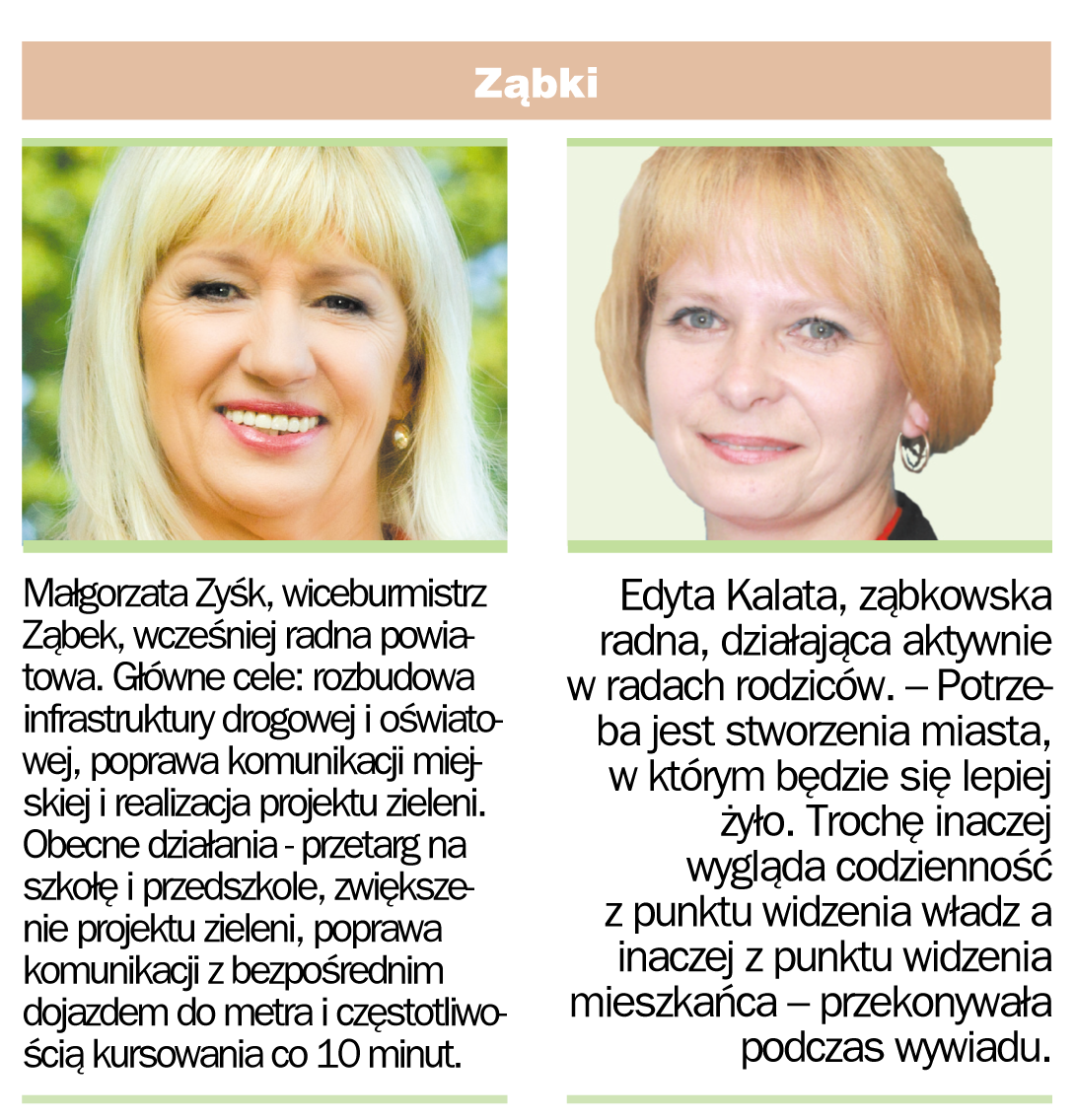 Ząbki ? do drugiej tury wyborów przeszły dwie Panie – Małgorzata Zyśk ? wiceburmistrz Ząbek,  wcześniej aktywnie działająca na rzecz  Ząbek radna Powiatu Wołomińskiego i wieloletnia dyrektor Publicznego Gimnazjum nr 2 w Ząbkach, od lat współpracująca z wieloma instytucjami a także organizacjami społecznymi, sportowymi i charytatywnymi oraz Edyta Kalata ? radna obecnej kadencji, wieloletnia przewodnicząca w radach rodziców miejscowych szkół.