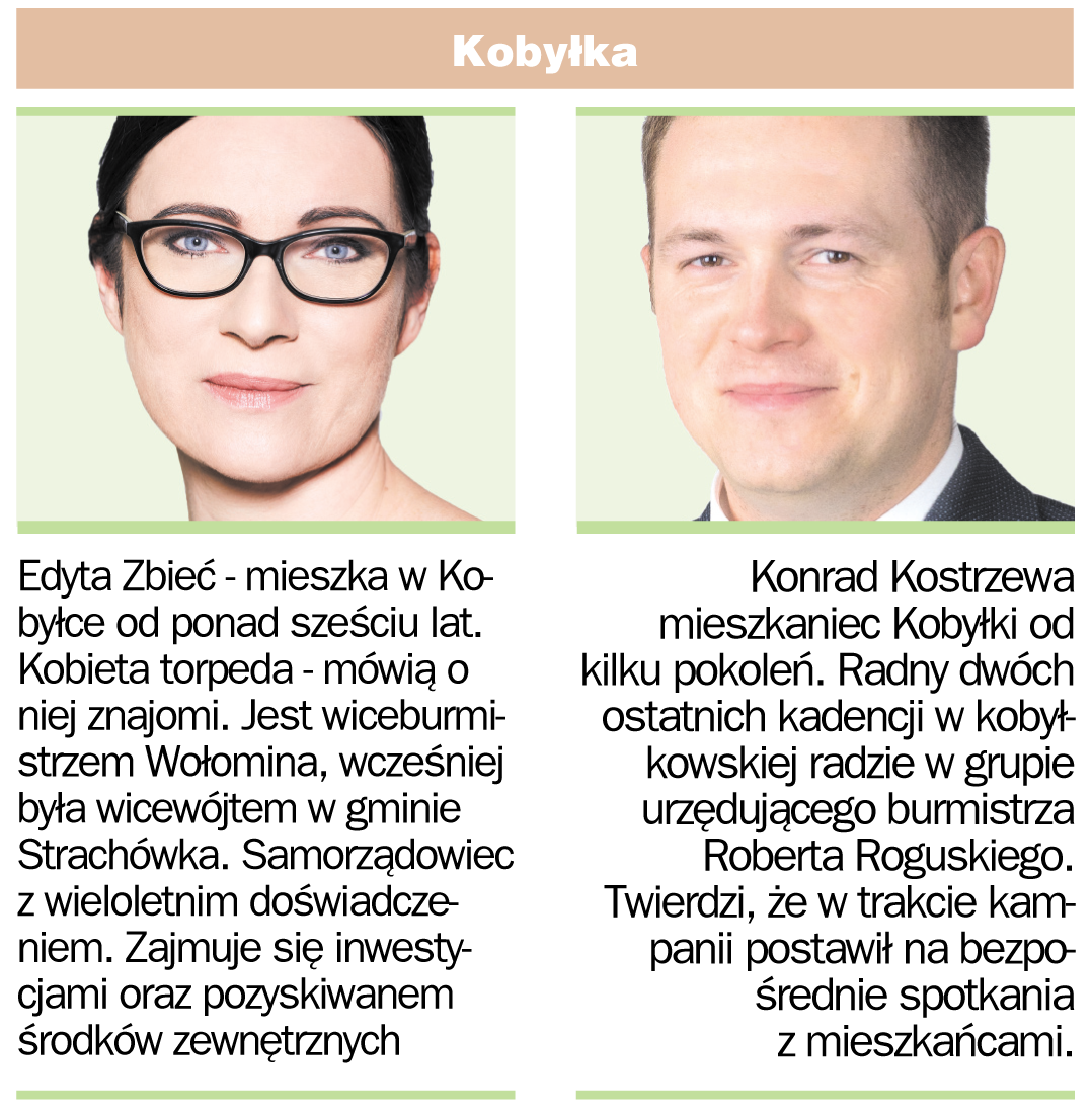 Kobyłka ? odbędzie się dogrywka pomiędzy obecnym radnym Konradem Kostrzewą rekomendowanym przez Roberta Roguskiego, który zrezygnował z ubiegania się o reelekcję a mieszkającą od ponad sześciu lat w tym mieście Edytą Zbieć, doświadczonego samorządowca obecną wiceburmistrz Wołomina .