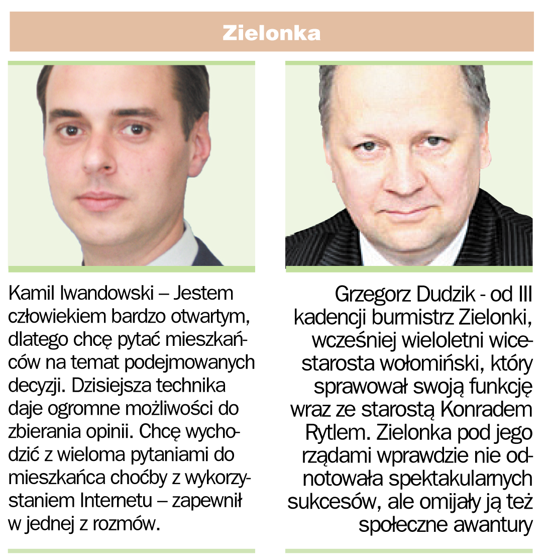Zielonka ? tu w szranki wyborcze stanie urzędujący burmistrz Grzegorz Dudzik, który zmierzy się z o wiele od siebie młodszym Kamilem Iwandowskim, który zdecydowanie wygrał pierwszą turę, jednak nie osiągnął wymaganych ponad 50% głosów poparcia.
