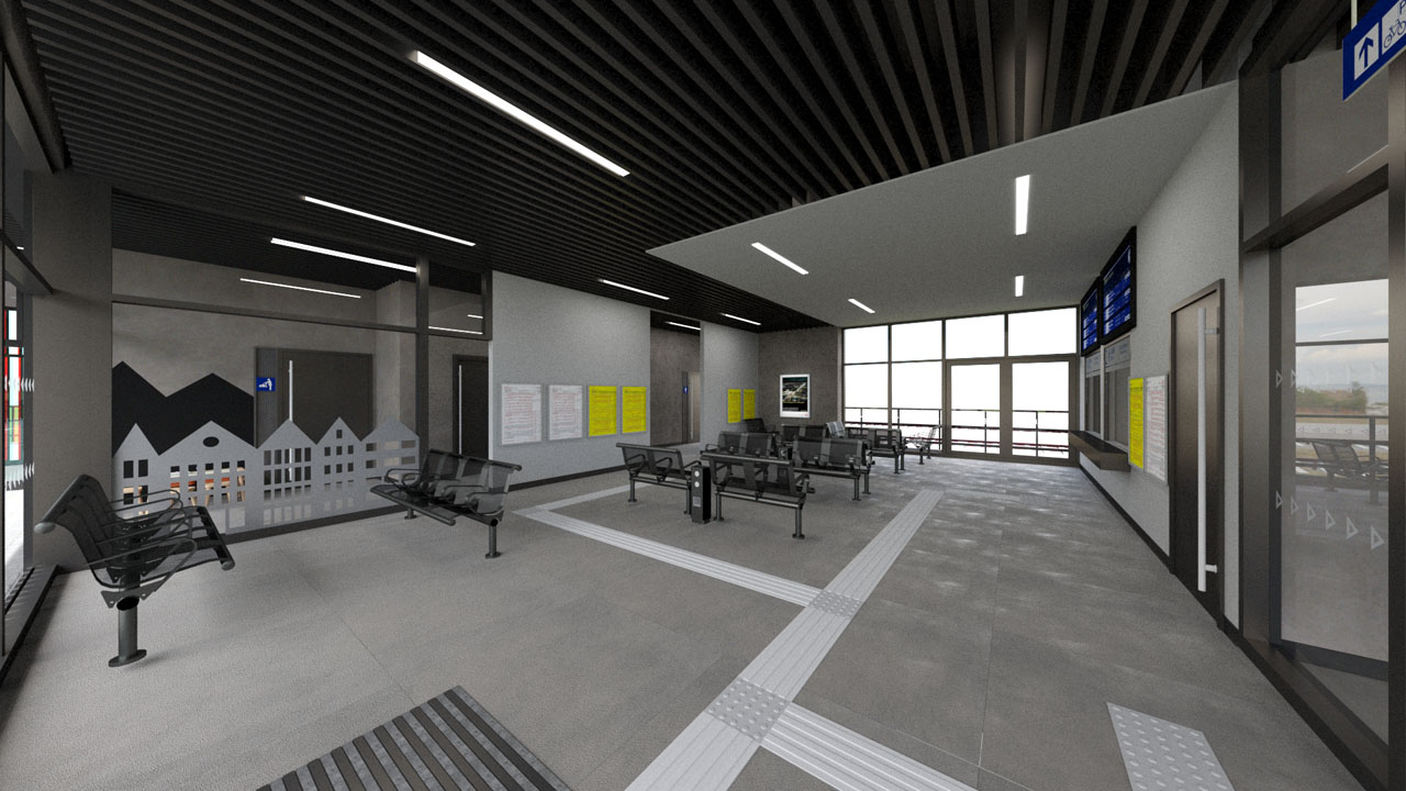 Wnętrze dworca zaprojektowano równie nowocześnie. Hol będzie utrzymywany w odcieniach bieli i szarości. Z bielą ścian będą współgrała szara, gresowa posadzka, sufit wykonany z białych płyt (w pobliżu kas) oraz aluminiowych lameli (listew) w kolorze antracytowym. We wnętrzu holu-poczekalni podróżni znajdą ławki, gabloty z rozkładami jazdy, a także elektroniczne tablice przyjazdów i odjazdów pociągów. W pobliżu ławek będą ustawione również specjalne słupki do ładowania urządzeń mobilnych z portami USB. W pobliżu poczekalni zaprojektowano specjalny kącik zabaw dla najmłodszych z pomieszczeniem dla opiekuna z dzieckiem. W sąsiedztwie znajdą się jeszcze toalety oraz pomieszczenia kas biletowych. Resztę powierzchni dworca zajmą lokale na wynajem i biurowe oraz przestrzenie związane z techniczną obsługą budynku.