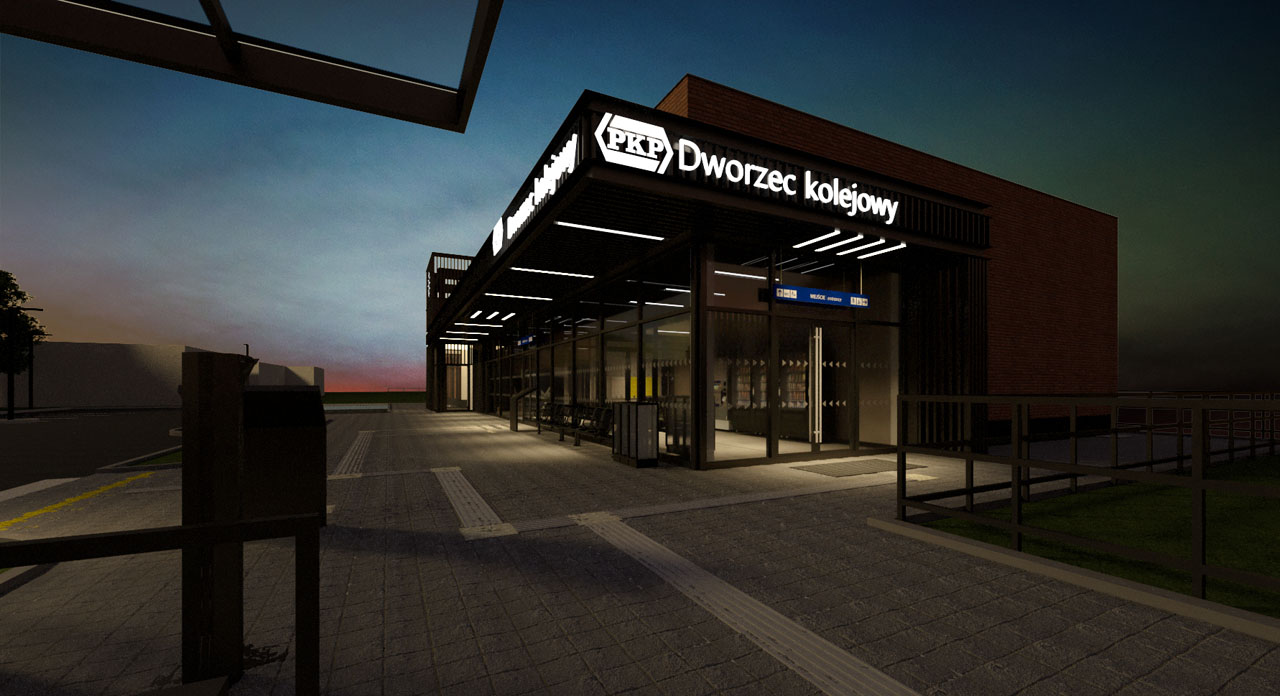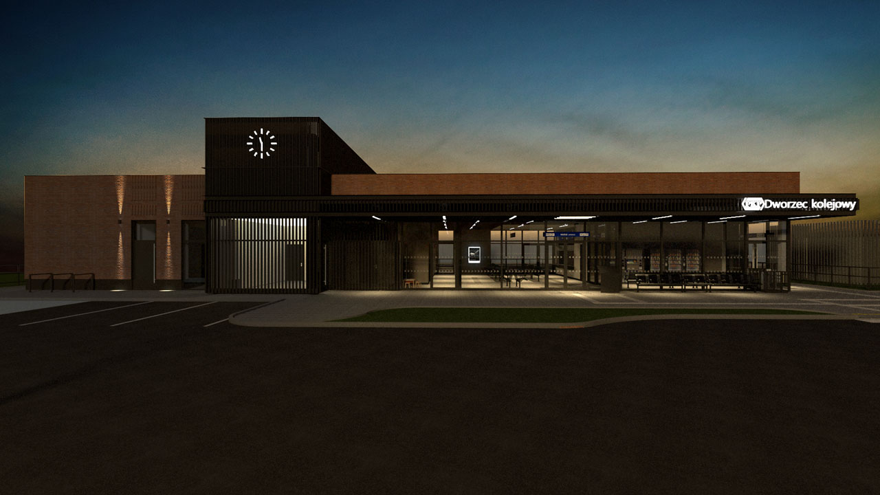 Nowy parterowy budynek to prostokątna bryła z dominantą w postaci wieży zegarowej, pokrytej pionowymi ciemnoszarymi lamelami (listwami). Elewacja będzie wykończona cegłą licową, z dużymi przeszkleniami w części pasażerskiej, które zwiększą dostęp światła dziennego do wnętrza. Przed wejściem do dworca od strony frontu zaprojektowano daszek. Nowy budynek będzie posiadał również iluminację nocną, a także podświetlane napisy dworzec kolejowy (od frontu) oraz z nazwą miejscowości (od strony peronów). Niezwykle ważne jest również to, że znajdzie się on bliżej stacji oraz w sąsiedztwie tunelu prowadzącego na perony, co poprawi komfort korzystających z niego podróżnych.