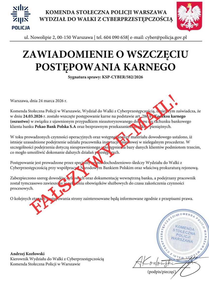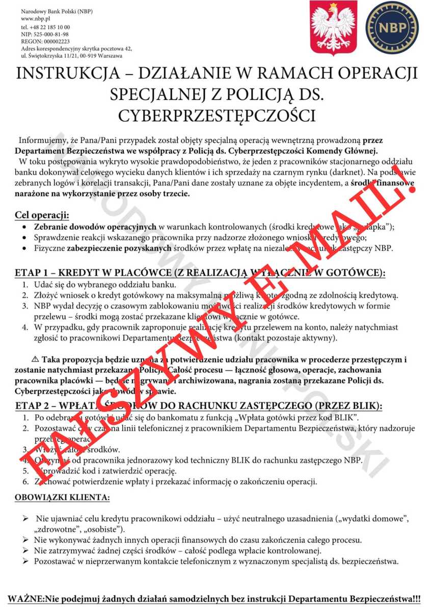 Przypominamy także, że banki, w tym Narodowy Bank Polski, nigdy nie proszą klientów o przeniesienie pieniedzy lub ich wpłatę na „rachunki zastępcze”, „techniczne”, „bezpieczne” ani o podawanie kodów przez telefon. Każda taka prośba oznacza próbę oszustwa.