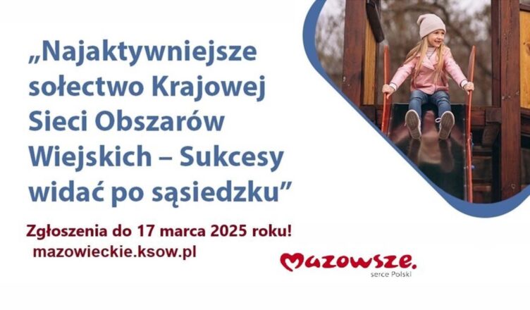 Konkurs „Najaktywniejsze sołectwo Krajowej Sieci Obszarów Wiejskich – Sukcesy widać po sąsiedzku!” jest organizowany już po raz dziewiąty. Mogą wziąć w nim udział mazowieckie sołectwa, które realizują prorozwojowe działania, m.in. wykorzystują innowacyjne technologie, wdrażają koncepcję Smart Villages, aktywizują lokalne społeczności, wspierają spółdzielczość i grupy producenckie czy tworzą miejsca pracy. W tegorocznej edycji pula nagród wynosi 40 tys. zł.