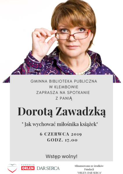 Gminna Biblioteka Publiczna w Klembowie zaprasza w czwartek 6 czerwca, o godz. 17:00, rodziców, opiekunów, dziadków i wszystkich zainteresowanych na spotkanie z Dorotą Zawadzką ? „Supernianią”. Temat spotkania: ?Jak wychować miłośnika książek?.