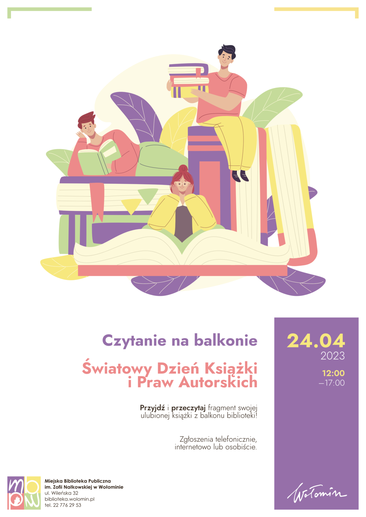 Miejska Biblioteka Publiczna w Wołominie zaprasza do wspólnego świętowania Światowego Dnia Książki i Praw Autorskich, które jak co roku będzie przebiegało pod hasłem: „W Wołominie dzień wspaniały, czyta duży, czyta mały”