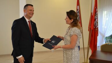 21 sierpnia 2020r. Burmistrz Tłuszcza Paweł Bednarczyk wręczył Pani Ewie Romańskiej dokument powierzenia stanowiska Dyrektora Przedszkola Samorządowego ?Baśniowa Kraina? w Tłuszczu. Ewa Romańska