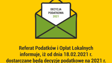 Referat Podatków i Opłat Lokalnych UM Ząbki informuje, iż od dnia 18.02.2021 r. dostarczane będą decyzje podatkowe na 2021 r. Więcej informacji z