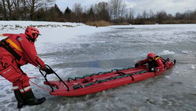 W dniach 15, 22 i 23 stycznia 2025 roku zmiany służbowe JRG Wołomin zrealizowały zajęcia doskonalenia zawodowego z ratownictwa lodowego na zbiorniku wodnym