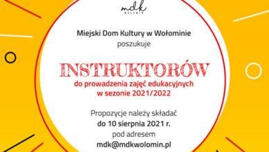 Miejski Dom Kultury w Wołominie zaprasza w dniach 12-13 września 2020 na Dzień Otwarty, podczas którego będzie możliwość zapisania się na zajęcia. Odbędą