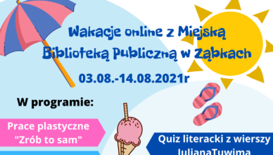 We wtorek, 3 sierpnia 2021r., rozpoczynają się Wakacje online z Miejską Biblioteką Publiczną w Ząbkach. Codziennie w dniach 03.08-14-08.2021r. na stronie internetowej i