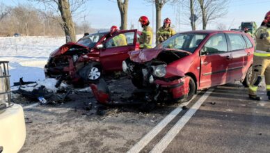 Zderzenie dwóch samochodów na granicy powiatów. Dwie osoby poszkodowane