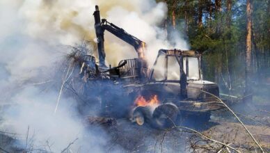 W miejscowości Stróżki (pow. wołomiński) podczas wycinki lasu zapalił się harwester – wieloczynnościowa maszyna leśna. Nikt nie odniósł obrażeń. W akcji gaśniczej uczestniczyli