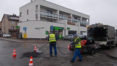 Wysokie temperatury otoczenia umożliwiły przystąpienie do prac nad usuwaniem ubytków na drogach gminnych, za pomocą rozgrzanej emulsji asfaltowej i grysu bazaltowego. Tego typu