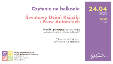 Miejska Biblioteka Publiczna w Wołominie zaprasza do wspólnego świętowania Światowego Dnia Książki i Praw Autorskich, które jak co roku będzie przebiegało pod hasłem: