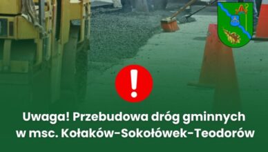 W związku z prowadzoną przebudową dróg gminnych w miejscowości Kołaków-Sokołówek-Teodorów w najbliższym czasie wystąpią czasowe utrudnienia w ruchu oraz ograniczenia w dojeździe do