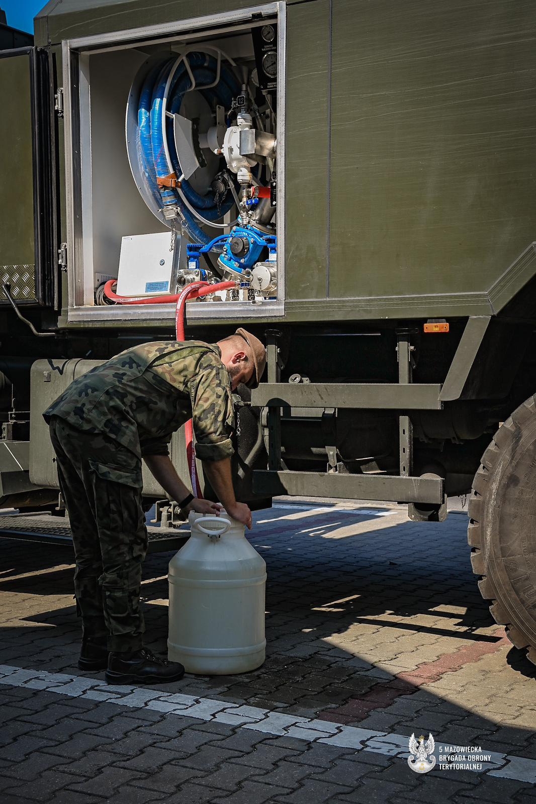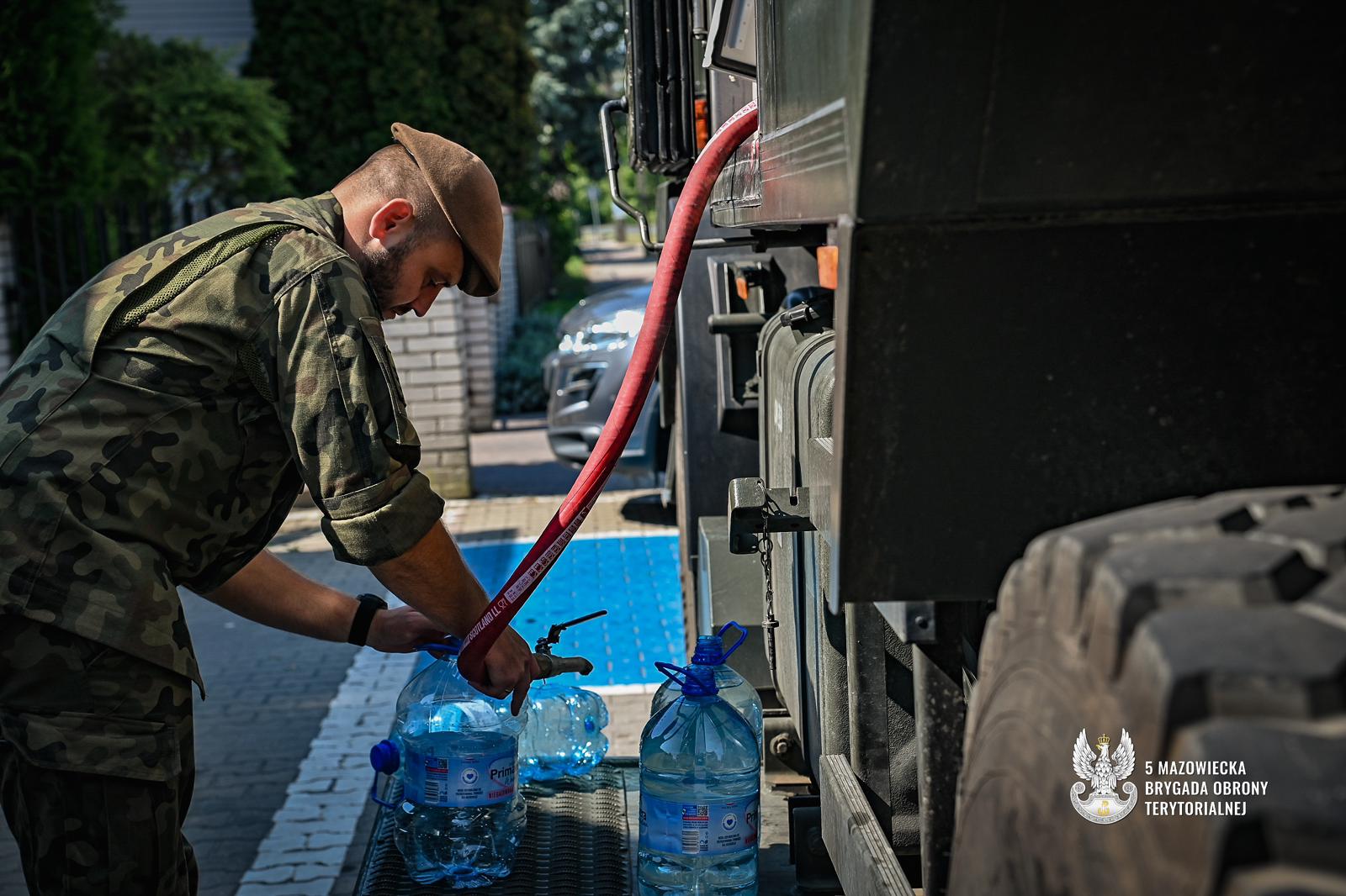 Żołnierze 5 Mazowieckiej Brygady Obrony Terytorialnej dostarczają wodę mieszkańcom gminy Staroźreby w powiecie płockim, którzy w wyniku skażenia lokalnego wodociągu zostali pozbawieni dostępu do bieżącej wody. To kolejny raz w tym okresie wakacyjnym, kiedy żołnierze 5MBOT zapewniają wsparcie społeczności lokalnej.