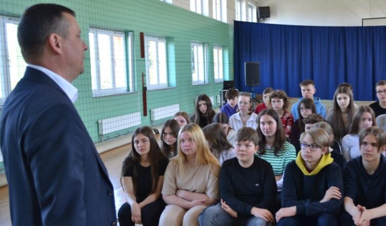Uczniowie pytają, Burmistrz odpowiada. Wizytą w Zespole Szkół w Miąsem Burmistrz Tłuszcza Paweł Bednarczyk rozpoczął cykl spotkań z uczniami klas 8 szkół podstawowych z terenu Gminy Tłuszcz w ramach „Lekcji z Burmistrzem”.
