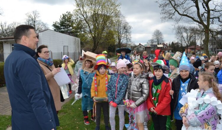 Uczniowie zaprezentowali przygotowane przez siebie stroje wykonane z odpadów selektywnych. Po pokazie uczestnicy wraz z opiekunami udali się na spotkanie z Panem Burmistrzem Pawłem Bednarczykiem, aby zaprezentować swoje stroje. Uczniowie rozmawiali też z naszym włodarzem na temat ekologii w naszym mieście. Uczestnicy zaśpiewali piosenkę ?Imieniny Ziemi?.