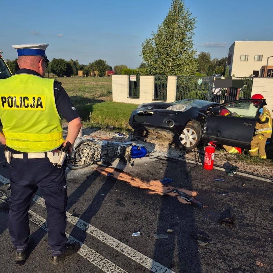 W m. Stary Kiełbów w pow. białobrzeskim na drodze wojewódzkiej 732 ok. 17.35 kierujący Nissanem w trakcie skręcania w lewo zderzył się z motocyklem, w wyniku czego na miejscu zginął 40-letni kierowca jednośladu i 59-letnia pasażerka osobówki. Kierowca samochodu był trzeźwy i przewieziony został do szpitala.