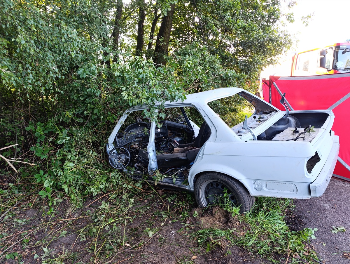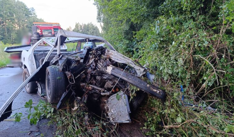 Zdekompletowany samochód pozbawiony m.in. drzwi, szyb, świateł, pasów bezpieczeństwa i tablic rejestracyjnych – a mimo to 30-letni mężczyzna zdecydował się wsiąść za jego kierownicę. Ta brawurowa decyzja kosztowała go życie. Mężczyzna zginął po zderzeniu z drzewami.