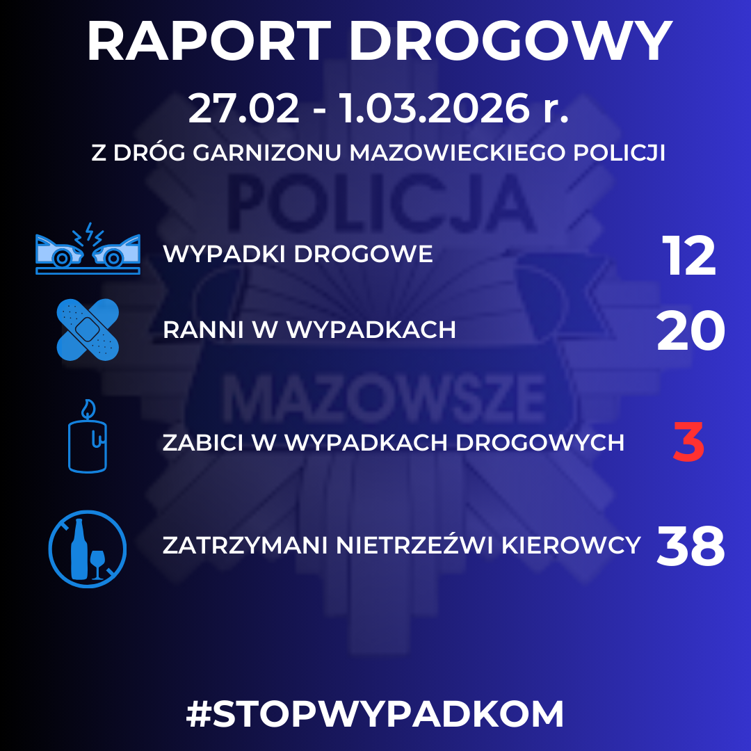 Miniony weekend (27 lutego – 1 marca 2026 r.) okazał się wyjątkowo tragiczny na drogach garnizonu mazowieckiego. W ciągu trzech dni doszło do 12 wypadków drogowych, w których śmierć poniosły 3 osoby, a 20 zostało rannych. Policjanci zatrzymali również 38 kierujących, którzy wsiedli za kierownicę pod wpływem alkoholu.