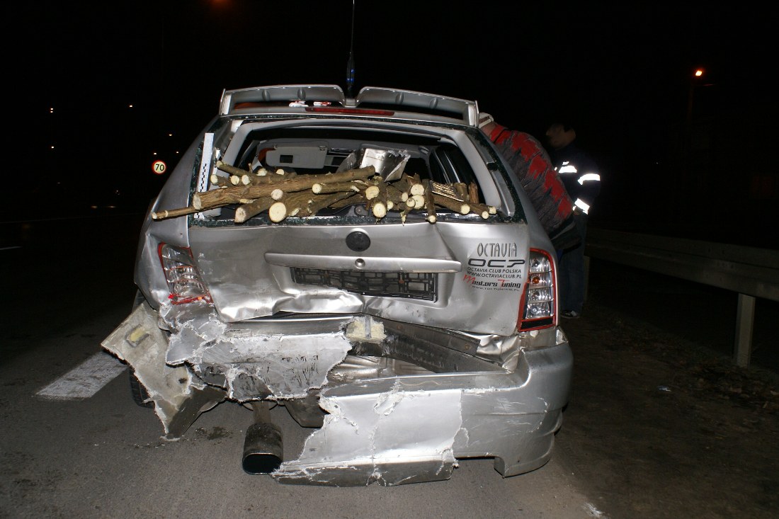 W tym samym miejscu około godziny 20 kierująca mitsubishi Gabriela G. wykonując manewr omijania radiowozu oznakowanego ford, biorącego udział w zabezpieczeniu miejsca wypadku drogowego ze skutkiem śmiertelnym, nie zachowała należytej odległości pomiędzy pojazdami i uderzyła w lewy bok radiowozu. W wyniku zderzenia w radiowozie uszkodzeniu uległy lewe przednie drzwi, błotnik oraz lusterko. Sprawce kolizji 43?letnią Gabrielę G. Policjanci ukarali mandatem karnym w wysokości 400 złotych.