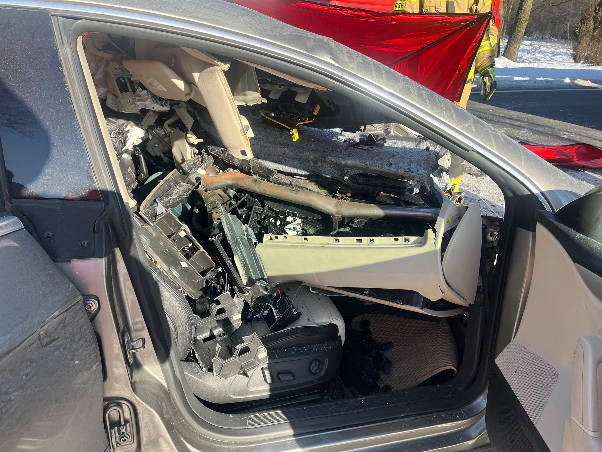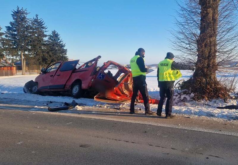 Ze wstępnych ustaleń wynika, że samochód osobowy zjechał z jezdni, po czym z dużą siłą uderzył w przydrożne drzewo. Skala zniszczeń pojazdu wskazuje na bardzo gwałtowne uderzenie – przód auta został dosłownie zmiażdżony, a elementy konstrukcji rozrzucone były w pobliżu miejsca zdarzenia.
