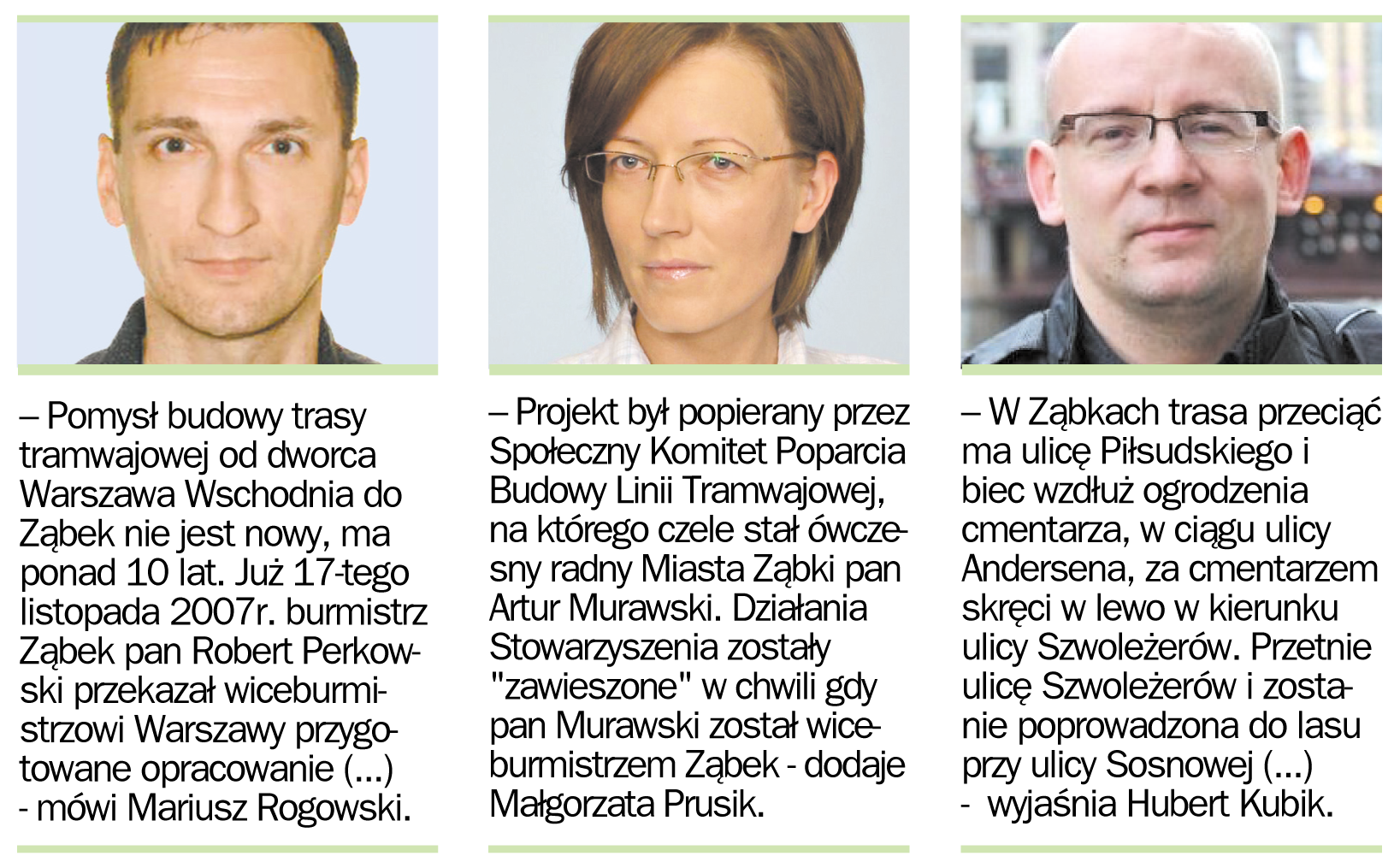 Mariusz Rogowski – Inicjatorem trasy tramwajowej do Ząbek był pan Robert Perkowski, wieloletni burmistrza Ząbek. Projekt był popierany przez specjalnie utworzony Społeczny Komitet Poparcia Budowy Linii Tramwajowej, na którego czele stał ówczesny radny Miasta Ząbki pan Artur Murawski. Działania Stowarzyszenia zostały „zawieszone” w chwili gdy pan Murawski został wiceburmistrzem Ząbek.