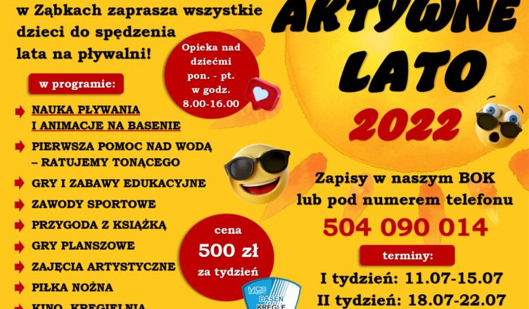 Po dwóch latach przerwy Miejskie Centrum Sportu w Ząbkach wraca z projektem ?Aktywne Lato?! Zapisy na półkolonie trwają od środy, 1 czerwca 2022 r. Biuro Obsługi Klienta MCS czynne jest w godz. 8.30-16.30, tel. 504-090-014.