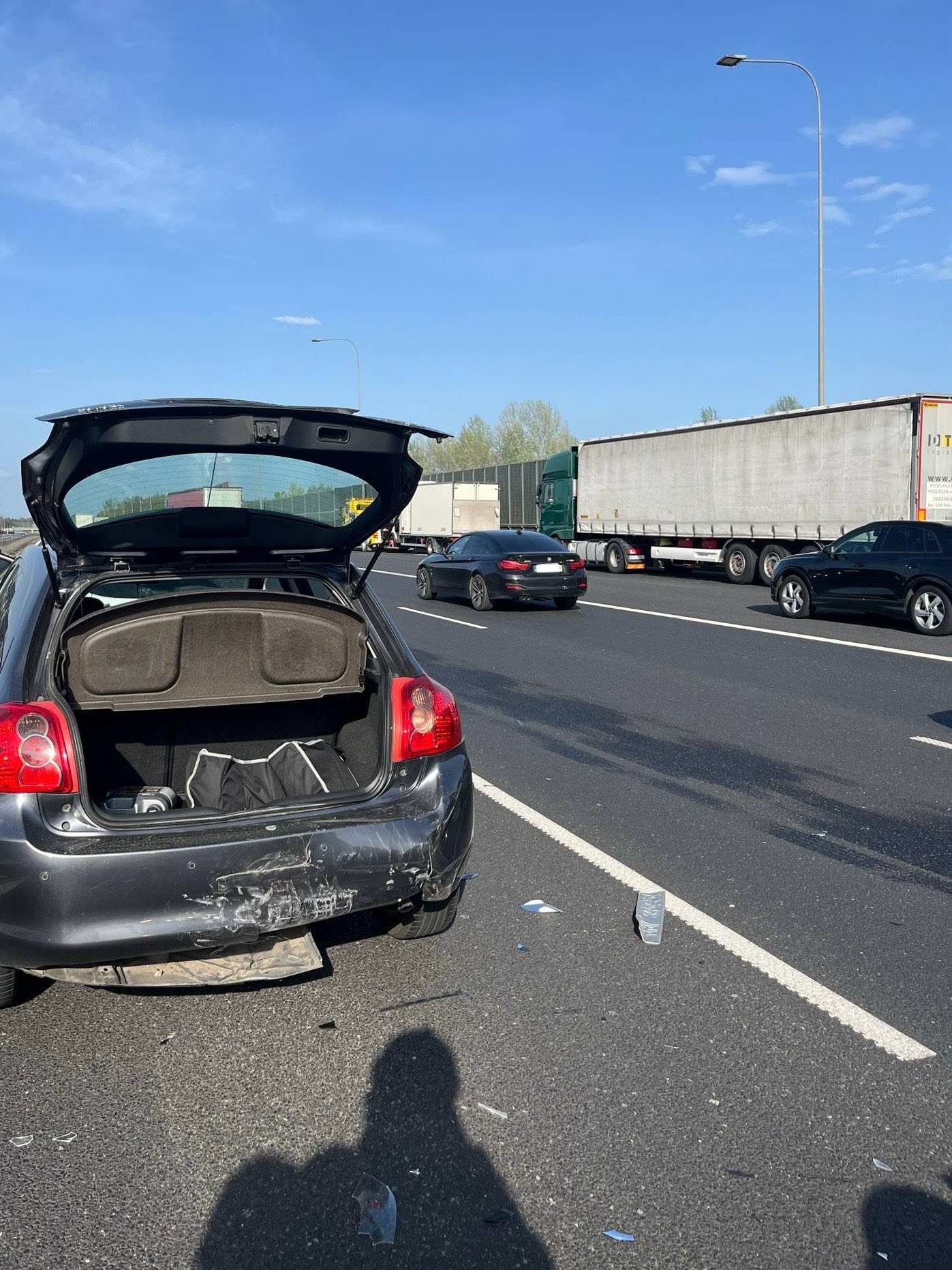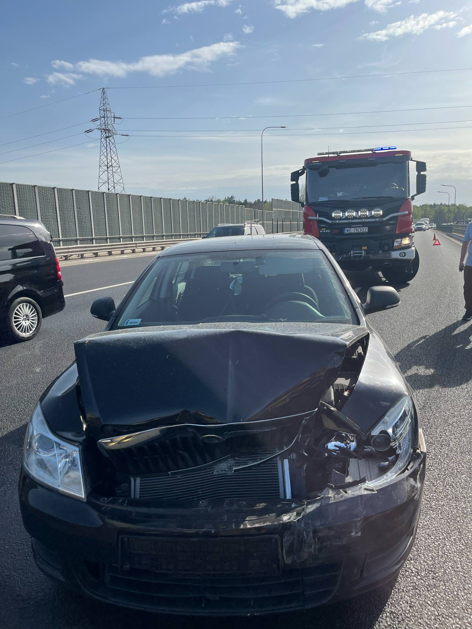 W wyniku zderzenia poważnie ucierpiał czarny samochód osobowy, który zatrzymał się na lewym pasie drogi ekspresowej. Przednia część auta została uszkodzona – maska uległa zgięciu i odkształceniu, zderzak częściowo oderwał się od konstrukcji, a prawa lampa przednia została całkowicie roztrzaskana.