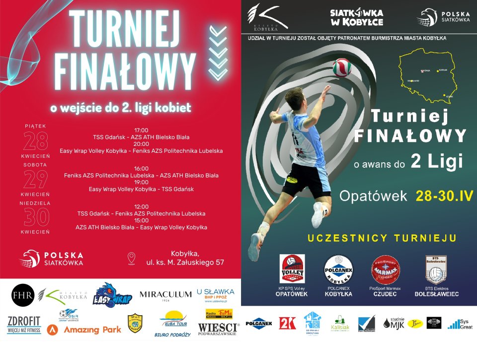 W najbliższy weekend 28-30 kwietnia 2023 r. kobyłkowscy siatkarze POLCANEX Kobyłka i siatkarki Easy Wrap Volley Kobyłka wezmą udział w Turniejach Finałowych o awans do II ligi. Finały objęte zostały Patronatem Burmistrza Miasta Kobyłka. Męski finał odbędzie się na hali widowiskowo-sportowej w Opatówku (ul. Szkolna 5). POLCANEX Kobyłka zmierzy się z drużynami – SPS Volley Opatówek, ProSport Marmax Czudec i BTS Elektros Bolesławiec.
