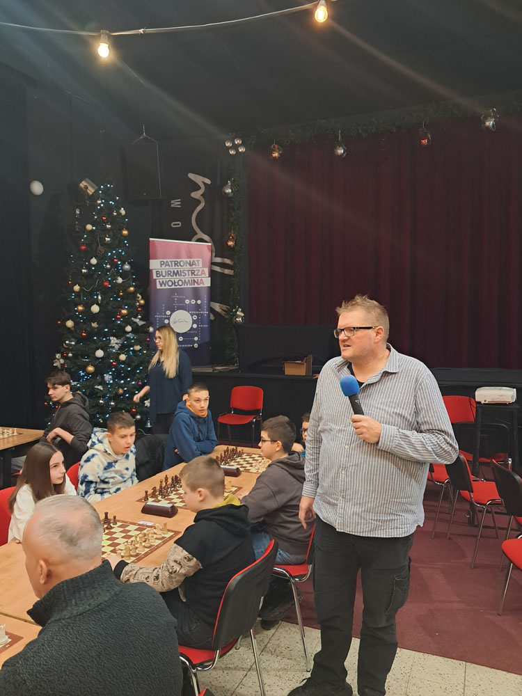 Turniej Szachowy o Puchar Dyrektora Miejskiego Domu Kultury Marty Rajchert odbył się dniach 14 – 15.12.2024 r. w sali teatralnej i w salach klubowych przy ul. Mariańskiej w Wołominie. Organizatorem turnieju był Miejski Dom Kultury
