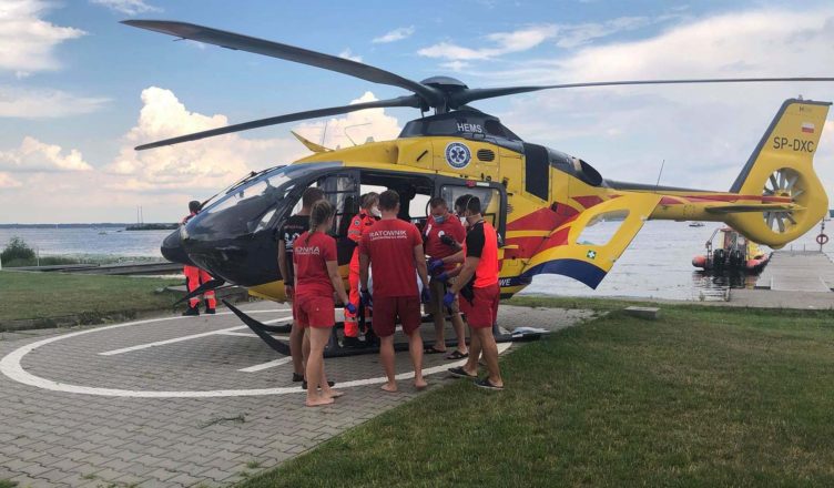 O godzinie 14.50 ratownicy będący na bazie zauważyli wypadek z udziałem dwóch skuterów wodnych przy plaży przy Hotelu 500. Kierująca skuterem wpłynęła w drugi w efekcie czego mężczyzna z niego wypadł. Natychmiast nasi ratownicy uzbrojeni w apteczkę, deskę ortopedyczną pobiegli w celu udzielenia pomocy. Okazało się, że pacjent jest przytomny, jednak ma uszkodzoną miednicę oraz nogę. Za chwilę dopłynęła Karetka Wodna oraz powiadomiono Policję. Uraz, którego doznał poszkodowany był na tyle poważny, że zespół Karetki zdecydował, że pacjent powinien być jak najszybciej przetransportowany do szpitala Śmigłowcem LPR. Pogoda jaką mamy sprzyja odpoczynkowi nad wodą, jednak róbmy to z głową! – informuje na swoim facebookowym profilu legionowskie WOPR