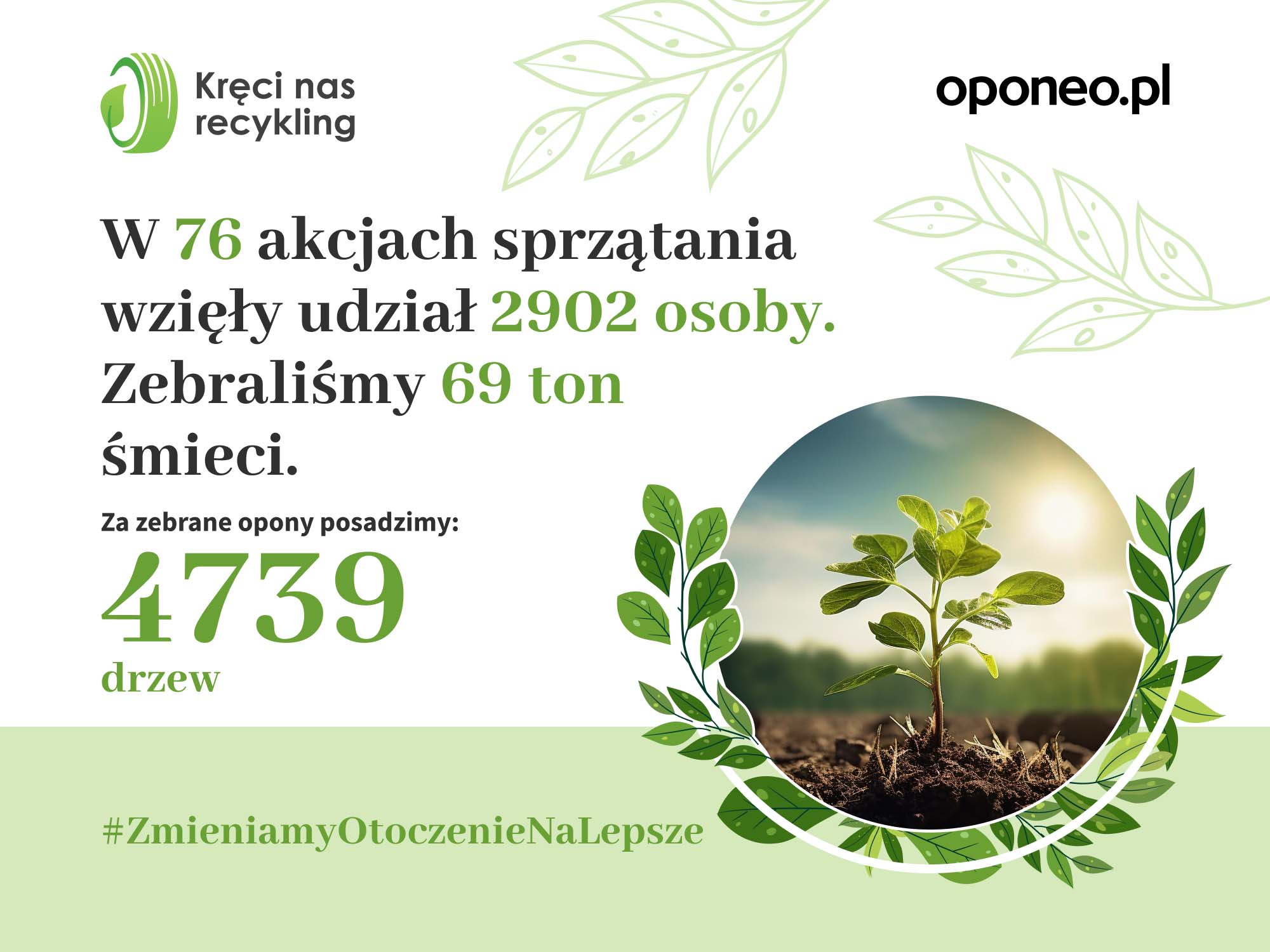 Firma Oponeo.pl zobowiązała się, że za każde 4 opony zebrane czasie trwania kampanii posadzi 1 drzewo. Obietnica ta zostanie wypełniona jesienią – wówczas 4739 sadzonek stworzy nowy fragment lasu. Będzie to ukoronowanie wspólnego sukcesu wszystkich uczestników Kręci Nas Recykling.