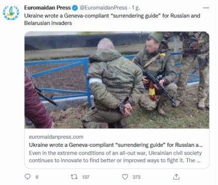 Nawet w ekstremalnych warunkach wojny totalnej ukraińskie społeczeństwo obywatelskie wciąż wprowadza rozwiązania, aby znaleźć lepsze i doskonalsze sposoby jej prowadzenia. Najbardziej efektywnym sposobem walki byłoby rozbrojenie wrogiego żołnierza, zanim zdążyłby oddać pierwszy strzał. Gdyby poddał się władzom ukraińskim po przekroczeniu granicy z Ukrainą, uratowałoby to zarówno jego życie, jak i życie Ukraińców – informuje Euromaidan Press