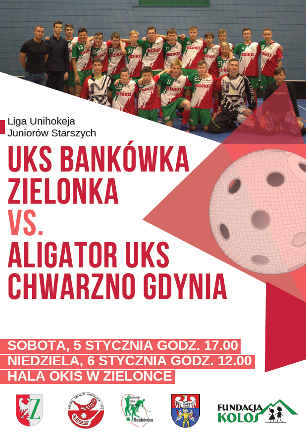 W najbliższy weekend 5-6 stycznia w Zielonce odbędą się spotkania Polskiej Ligi Unihokeja Juniorów Starszych pomiędzy UKS Bankówka Zielonka, a UKS Aligator Chwarzno Gdynia. Zapraszamy do kibicowania w hali sportowej OKiS.