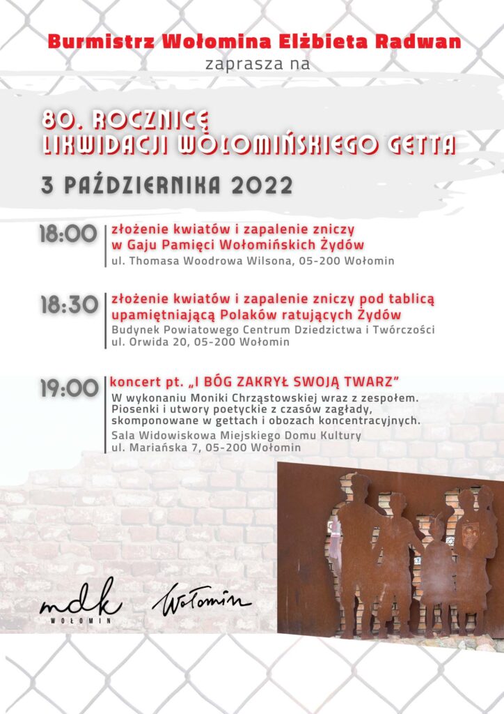 Podczas uroczystości złożymy kwiaty i zapalimy symboliczne znicze w Gaju Pamięci Wołomińskich Żydów oraz pod tablicą upamiętniającą Polaków ratujących Żydów. Dzień zakończymy koncertem pt. „I Bóg zakrył swoją twarz” w wykonaniu Moniki Chrząstowskiej wraz z zespołem. Usłyszymy piosenki i utwory poetyckie z czasów zagłady, skomponowane w gettach i obozach koncentracyjnych.