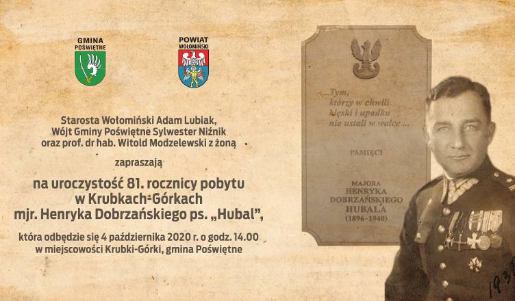 Starosta Wołomiński Adami lubiak i Wicestarosta Wołomiński Piotr Borczyński serdecznie zapraszają na uroczystości upamiętniające 81. rocznicę pobytu w Krubkach-Górkach mjr Henryka Dobrzańskiego ps. „Hubal”, które odbędą się w dniu 4 października o godz. 14:00 w Gmina Poświętne.