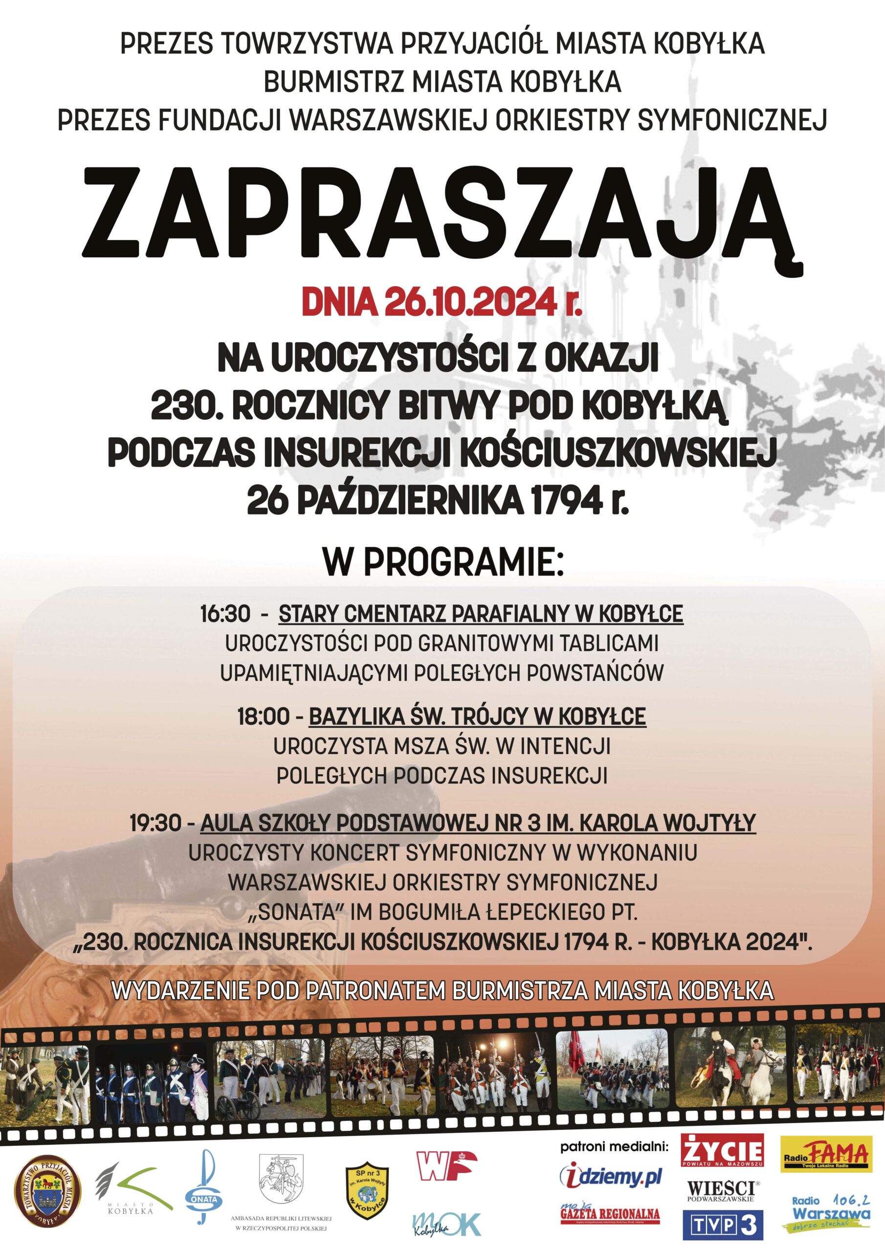 UM Kobyła w imieniu Towarzystwa Przyjaciół Miasta Kobyłka oraz Burmistrza Miasta Kobyłka Konrada Kostrzewy serdecznie zaprasza 26 października na Uroczystości z okazji 230. rocznicy Bitwy pod Kobyłką podczas Insurekcji Kościuszkowskiej 26 października 1794 r. Wydarzenie objęte zostało Patronatem Burmistrza Miasta Kobyłka.